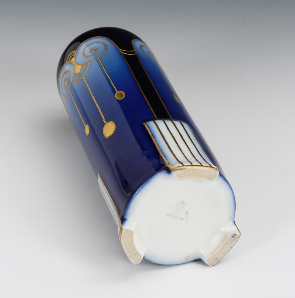 Zylindervase mit Kobaltfond und drei blauen Verlaufsfeldern, mit geometrischem Jugendstil-Dekor.