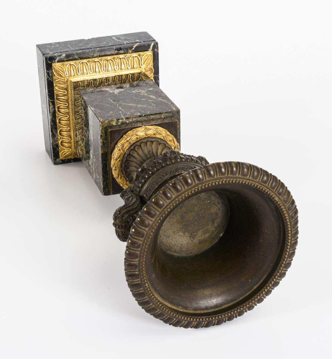 Hohes Marmor-Postament mit Blattfries. Darauf schlanker Glockenkrater mit vegetabiler Reliefzier. Geringe Chips am Marmor.