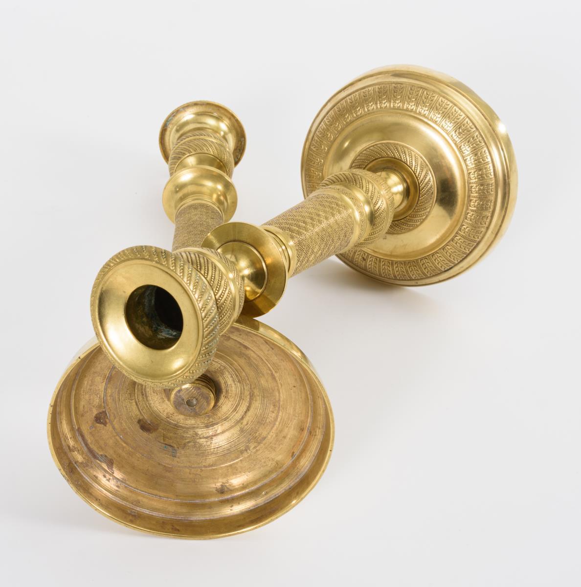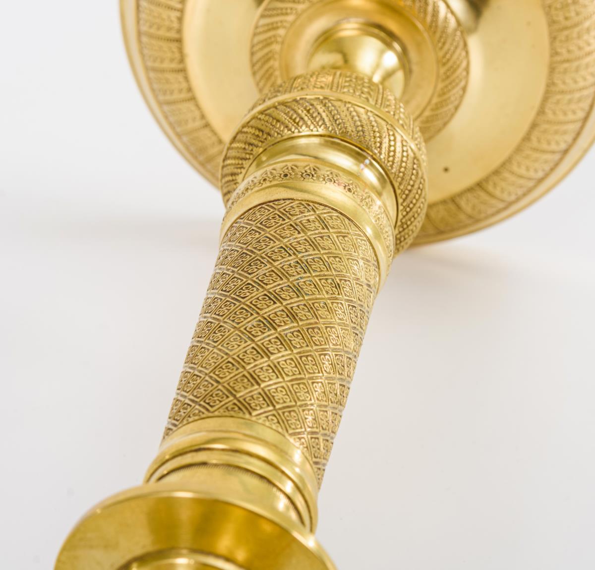 An Rundfuß, Säulenschaft und Vasentülle sehr fein reliefierte Bronzeleuchter. 2 kaum sichtbare Lötreparaturen, wenige Alters-/Gebrauchsspuren.