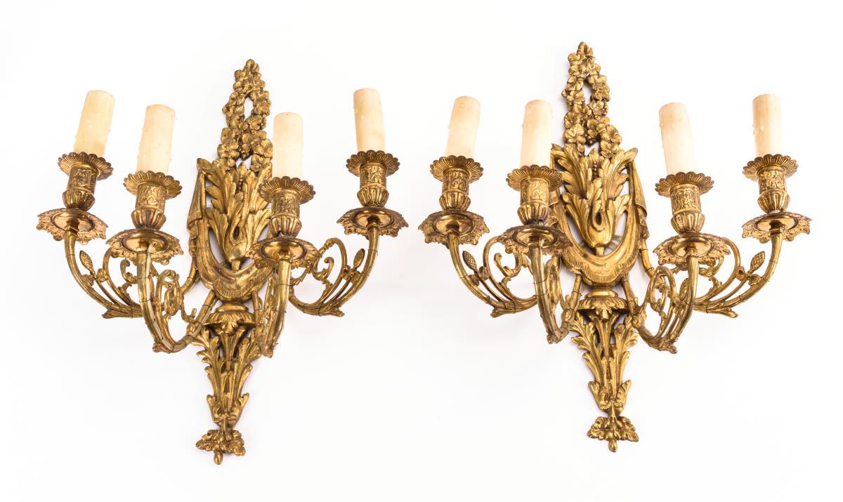 Wandappliken mit prächtigen Wandhalterungen im Louis-Seize-Stil und 4 teils gestuften Armen mit Rankenbesatz. Vasentüllen mit Schraubfassungen und Papp-Kerzenhülsen.