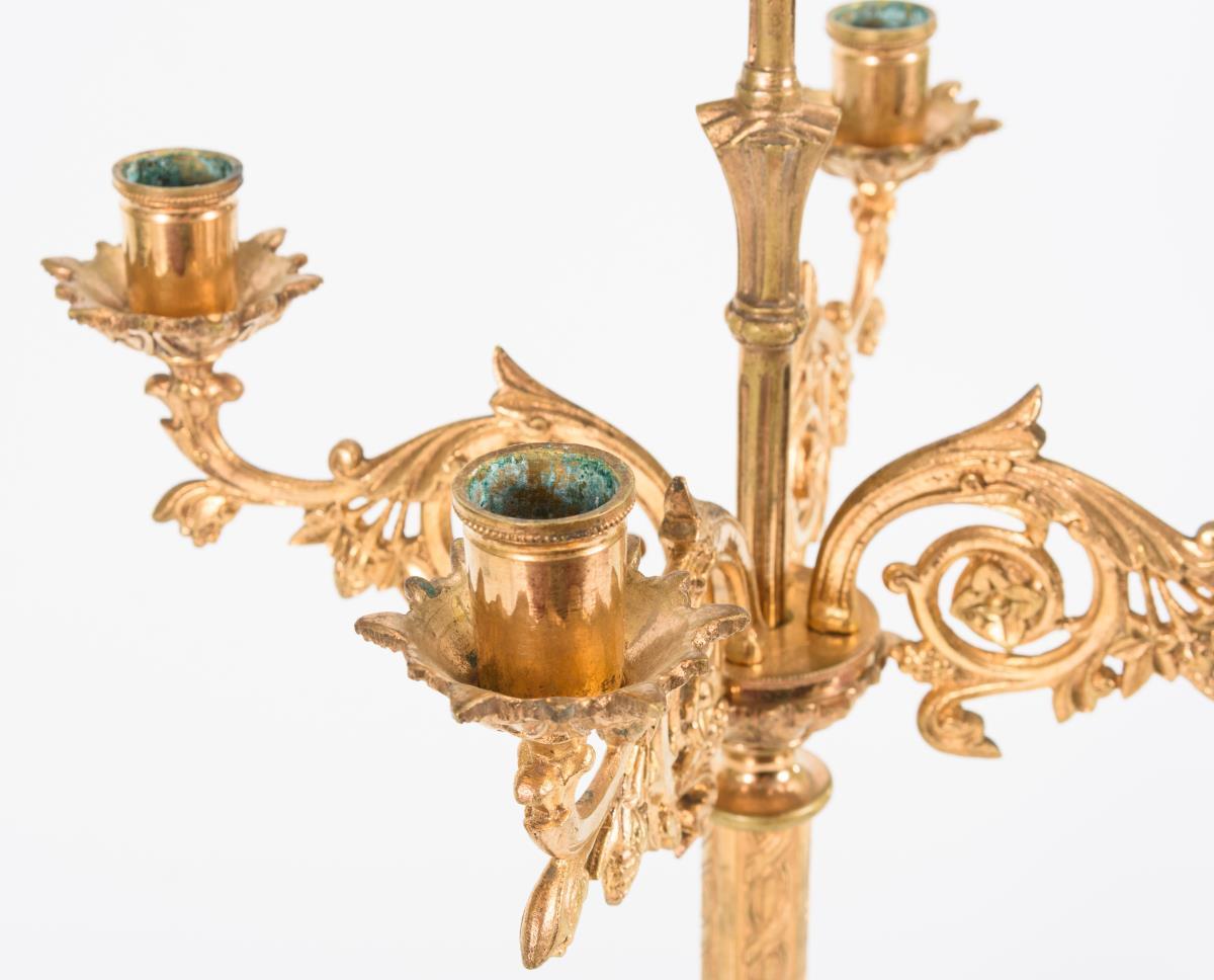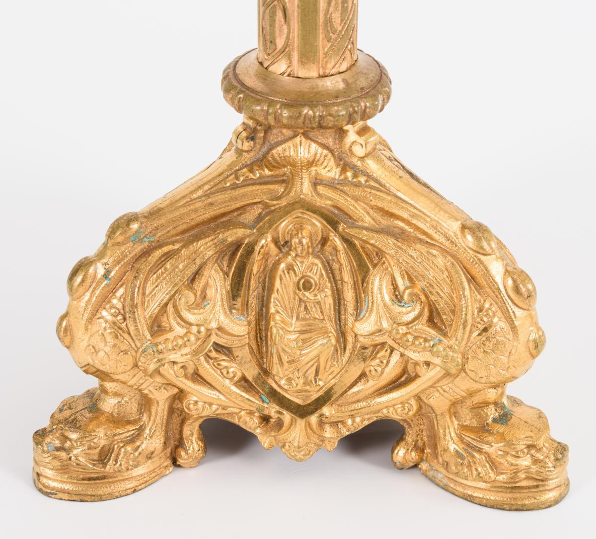 Überaus reich verzierter Bronzeleuchter mit 3-seitigem Drachenfuß und Christus in der Mandorla auf jeder Seite. Gewirtelter Schaft mit applizierten Blüten, 3 Rankenarmen und erhöhter Zentraltülle. Vergoldung etwas berieben.