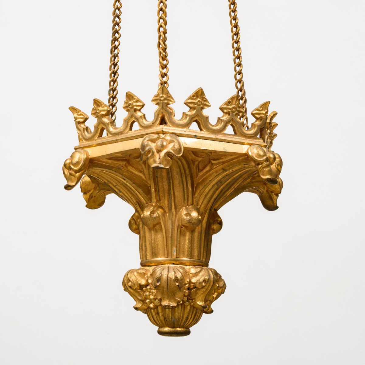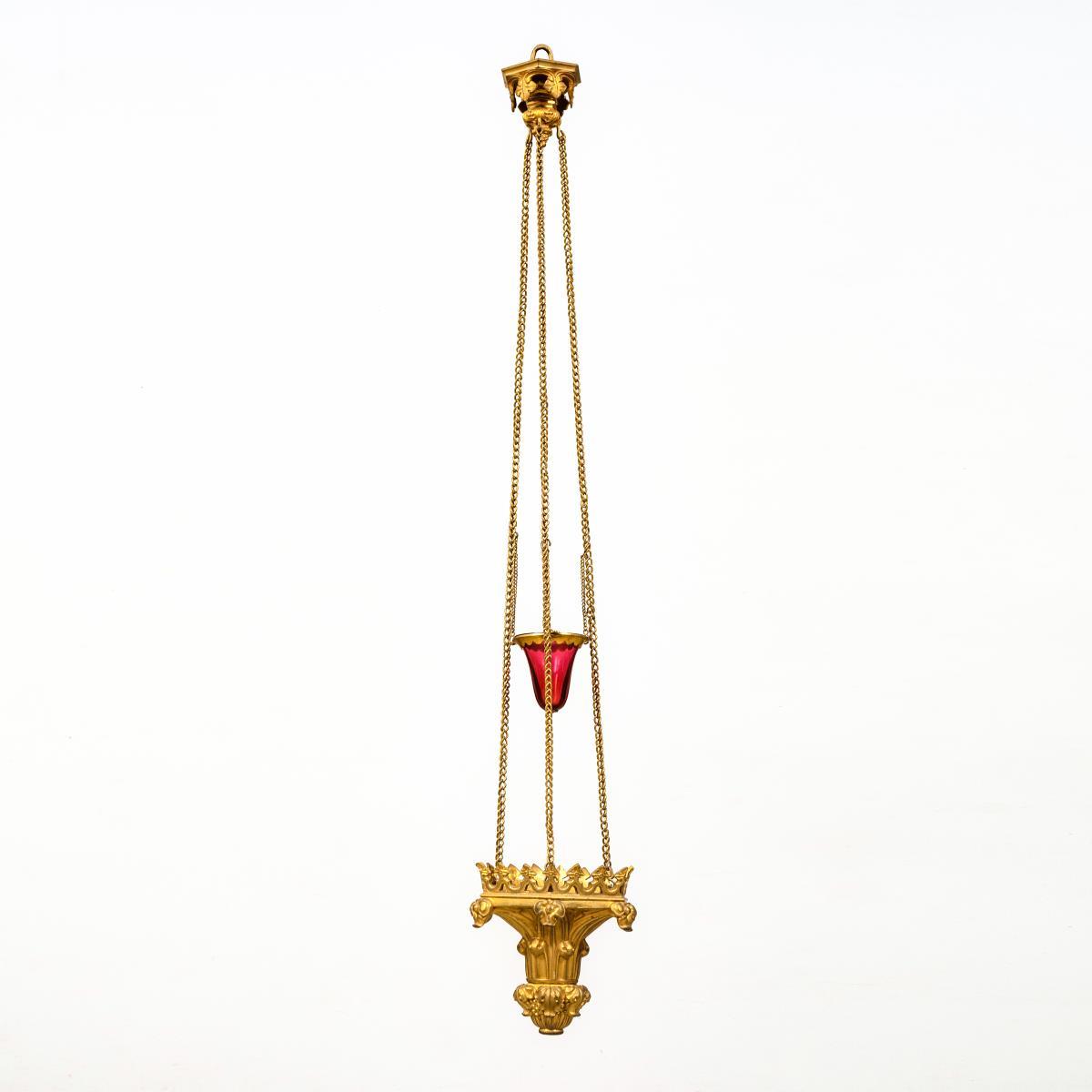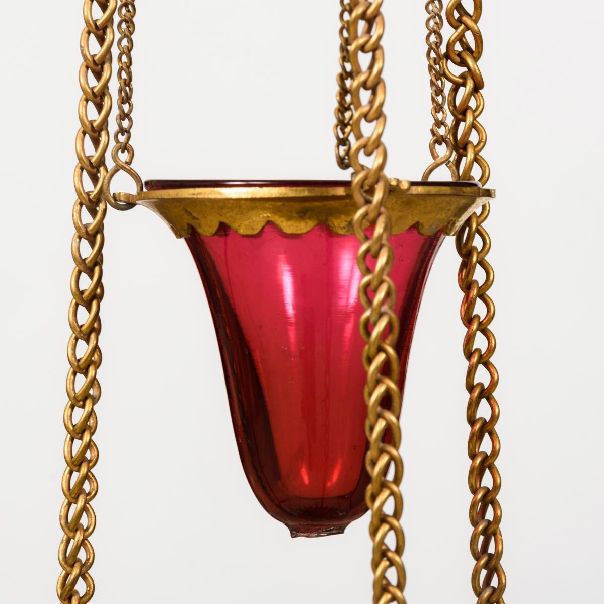 Sakrales Gerät mit Ampel in neogotischen Formen und "immerwährendem Licht" an 3-facher Kettenaufhängung, mit rotem gläsernem Weihrauchbehälter. Alters-/Gebrauchsspuren.