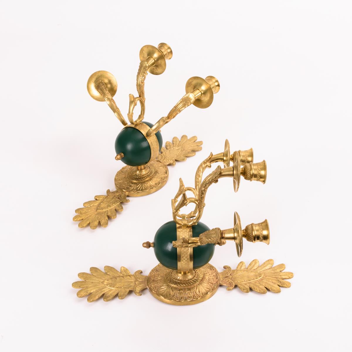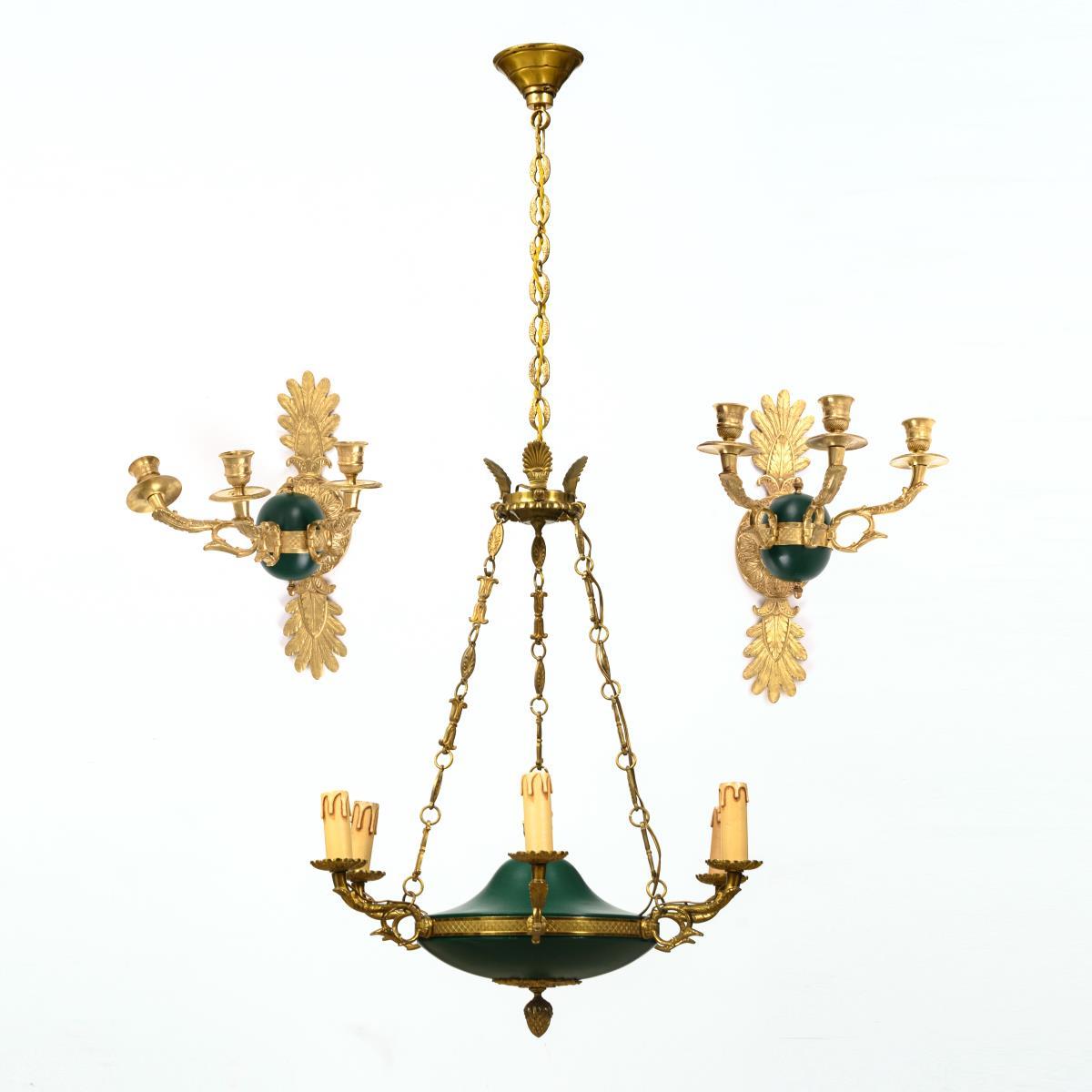 Deckenlampe und Wandleuchterpaar im Empire-Stil.