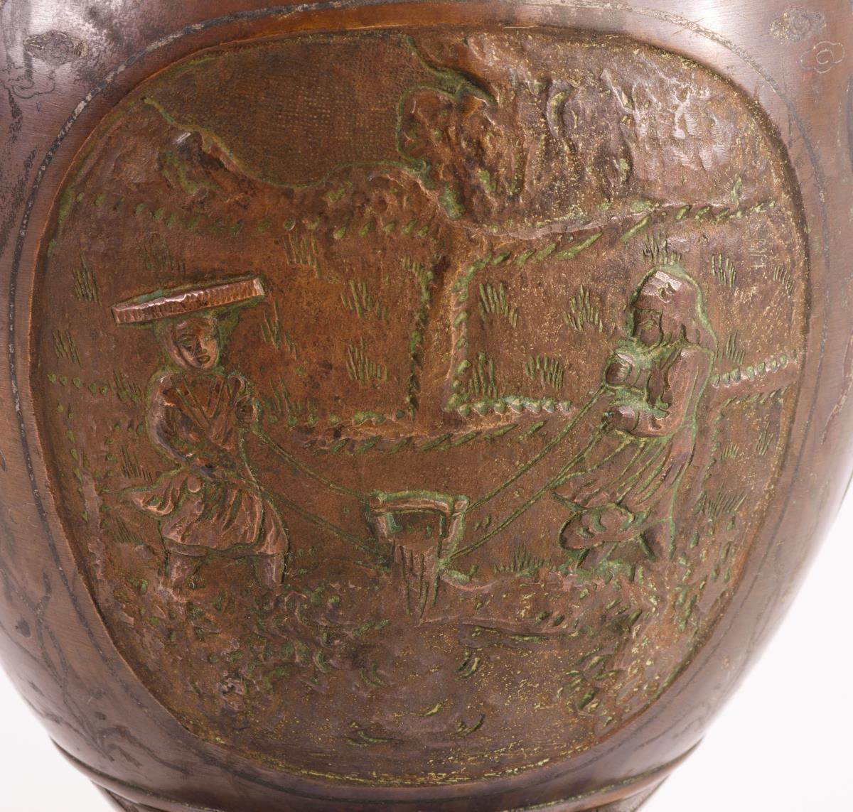 Balustervase mit zwei flach reliefierten Bildkartuschen. Bauern beim Reis pflanzen und Bauern beim Pflügen. Löwenkopfhandhaben mit Ringen, dazugehöriger Metallsockel mit Schriftzeichen. Dünne Metallintarsien zwischen den Kartuschen teils stark berieben.