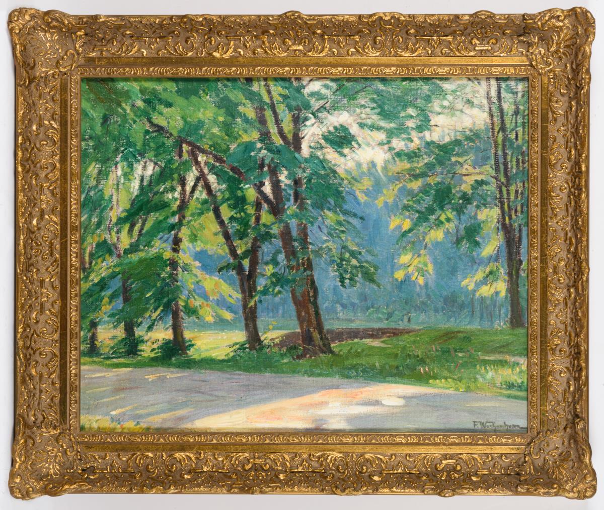 Sonnige Allee mit Schatten spendenden Bäumen vor Waldgebiet.