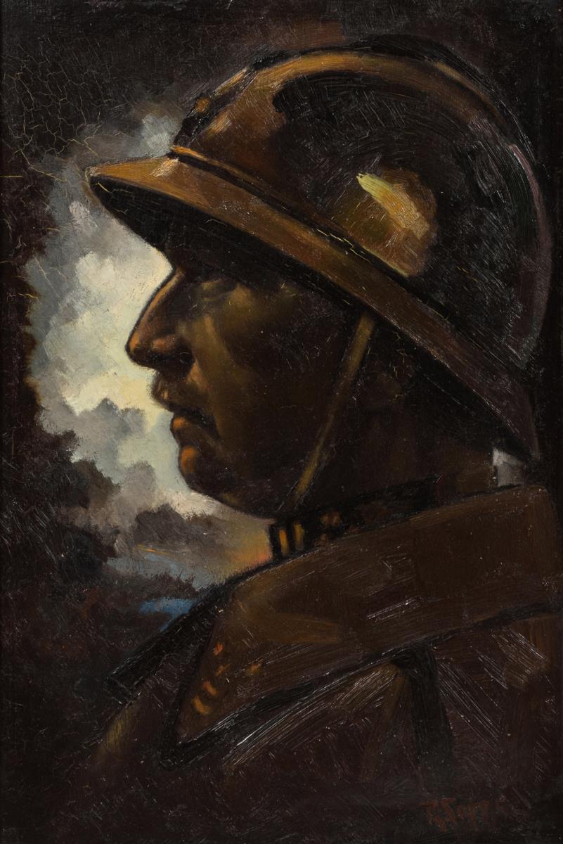 Nahezu ikonisches Bildnis eines Soldaten in Uniform mit Stahlhelm vor dunklem Wolkenhimmel.
