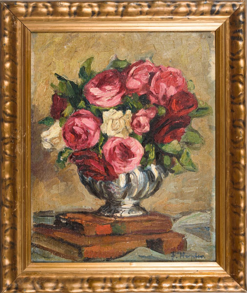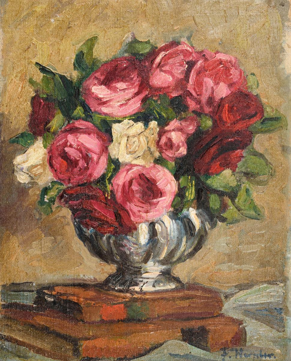Verschiedenfarbige Rosen in einer silbernen Schale auf einem Buch.