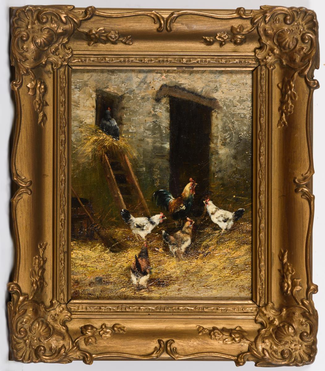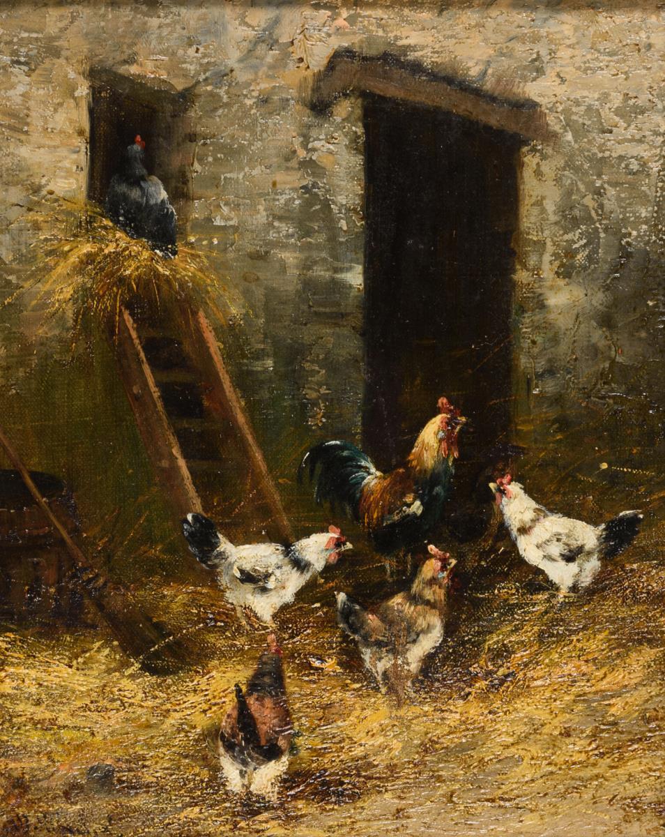 Das Geflügel vor dem Stall auf dem verstreut liegenden Stroh. Eine kleine restaurierte Stelle mit Hinterklebung.