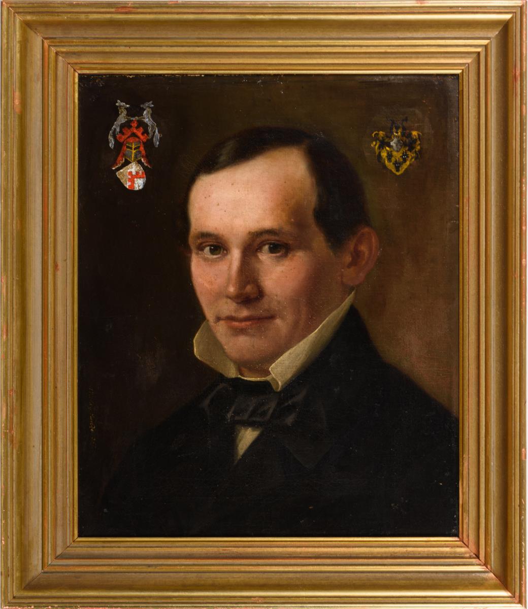 Bildnis eines jungen Mannes im schwarzen Anzug mit weißem Hemd. Nachtrag 16.10.2020: Bei den Wappen handelt es sich um die Adelsgeschlechter Buxhoeveden und Hastfer. Eine sehr kleine restaurierte Stelle mit Hinterklebung.