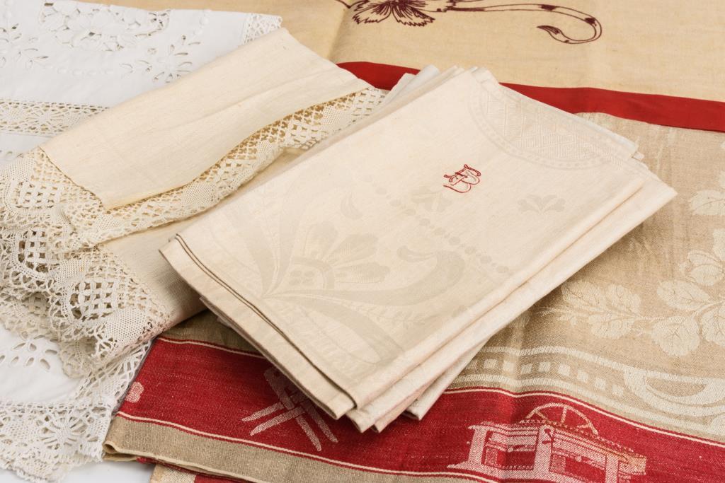 1 aufwendig gewebtes Rolltuch, Wäschetuch mit Stickerei, 9 Handtücher mit stiltypischem Dekor und Monogramm FB, Tischdecke mit Klöppelspitze, Tischdecke mit Weißstickerei und Klöppelspitze und 4 Klöppelspitzen-Einsätze.
