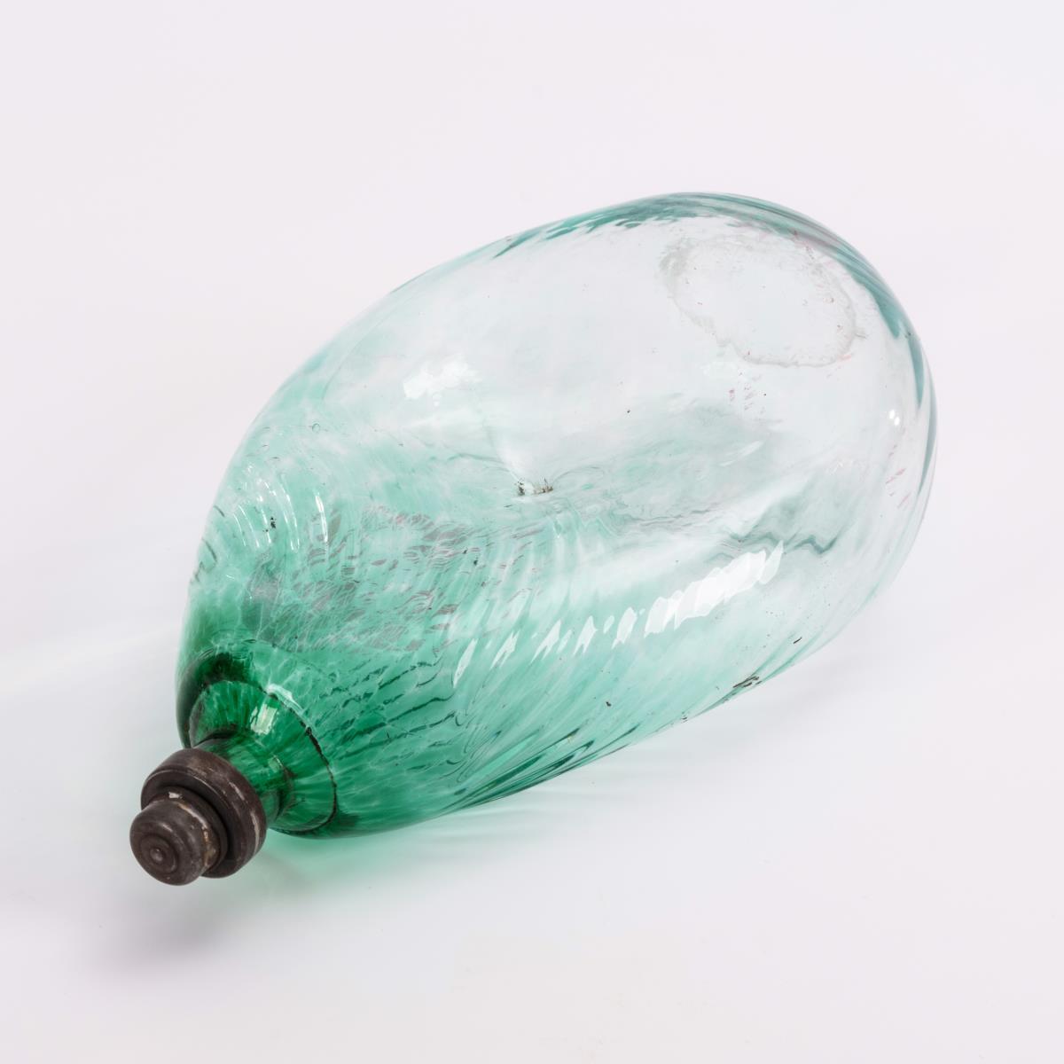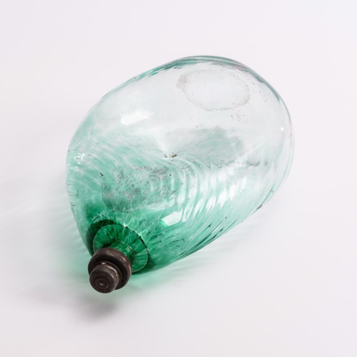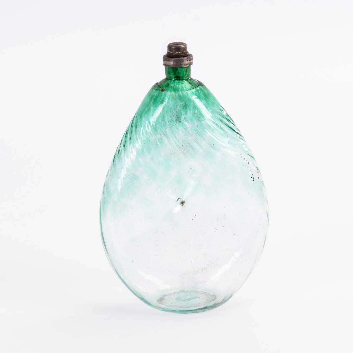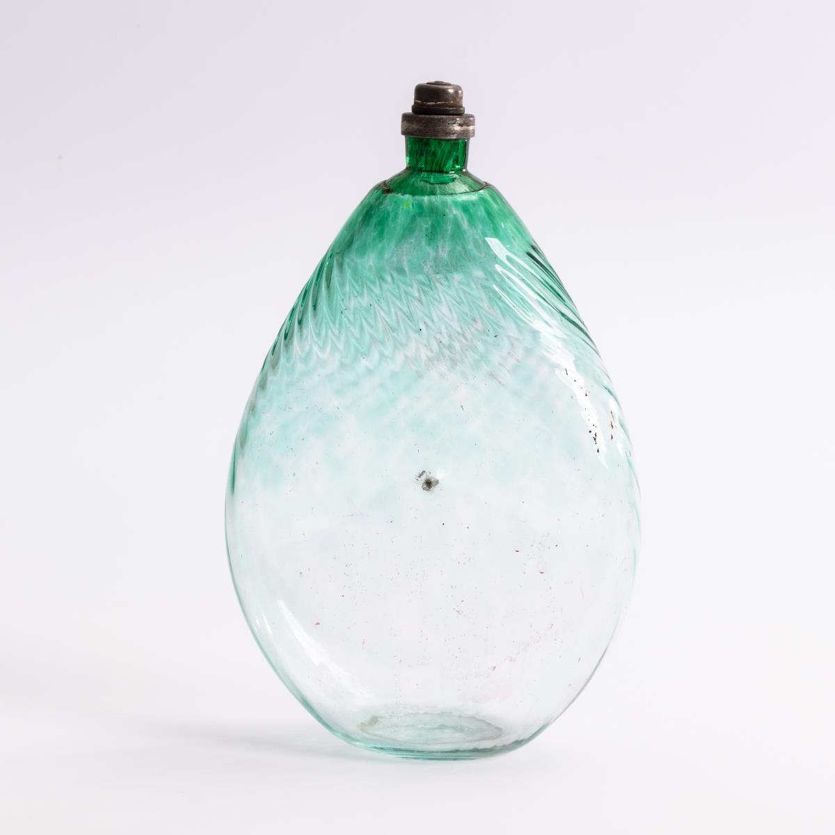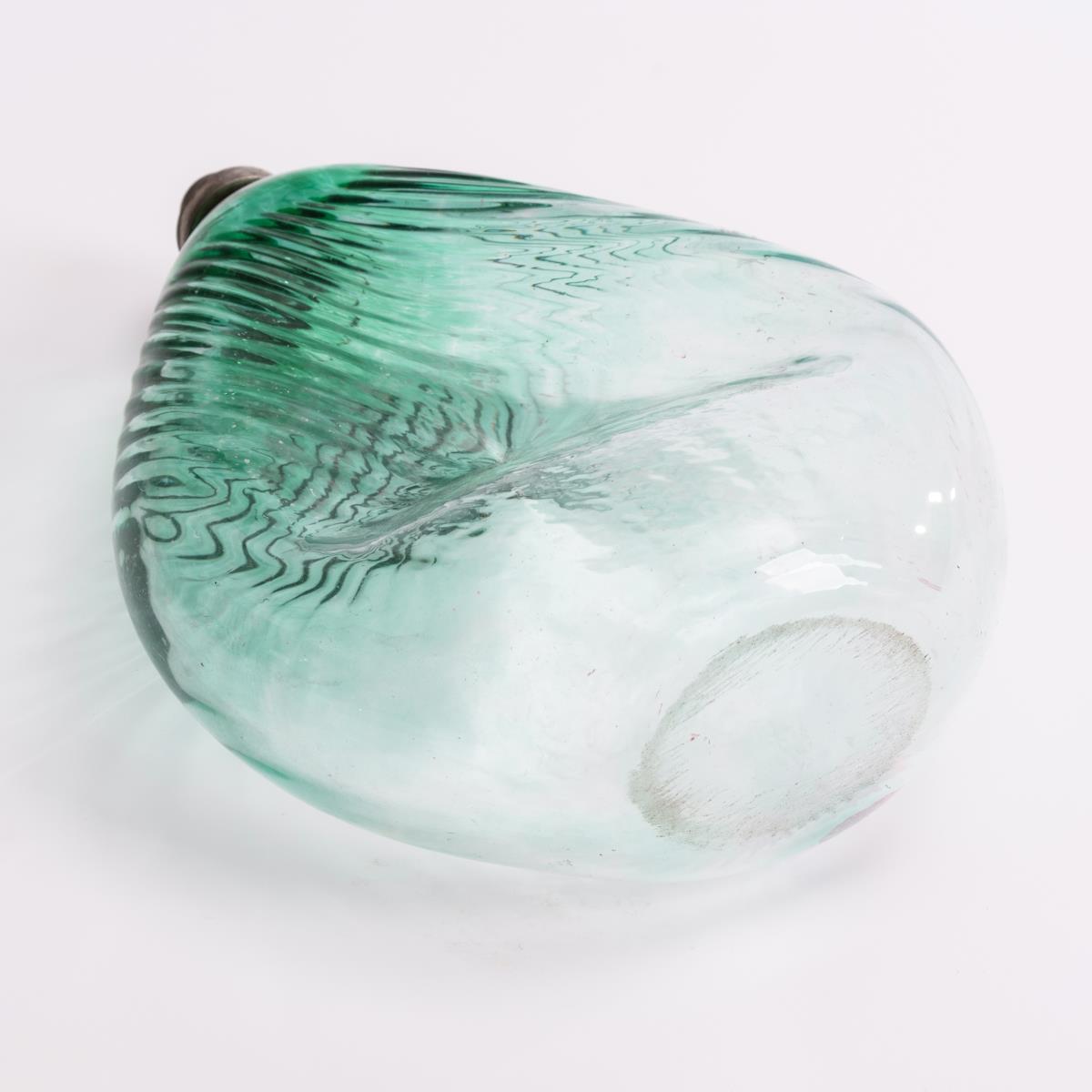 Schrägoptisch geblasene Plattflasche mit eingedelltem "Nabel", Zinnverschluss.