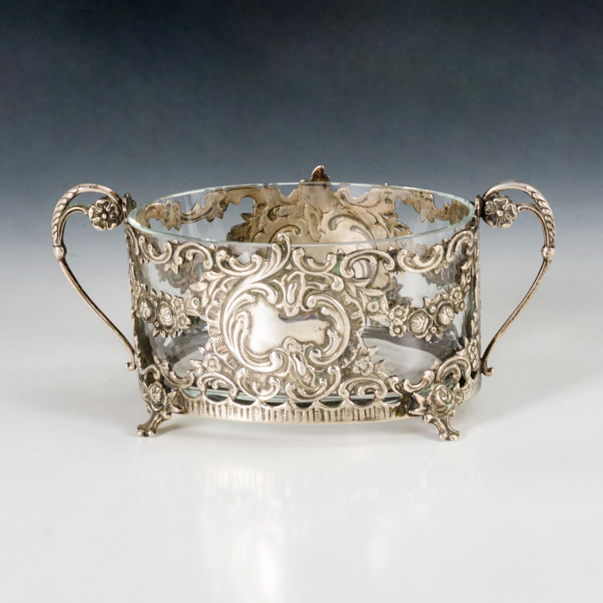Reliefierte, durchbrochene Wandung mit Rocaillen und Rosengirlanden. Glaseinsatz mit 1 winzigen Chip.