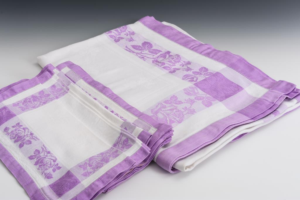 Tischdecke und 12 Servietten mit umlaufendem, violettem Rosendekor und Hohlsaum.