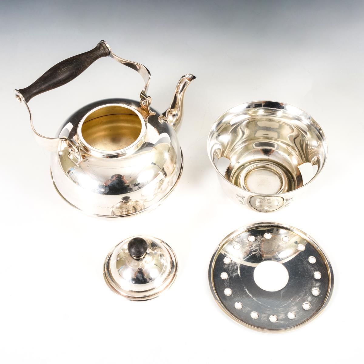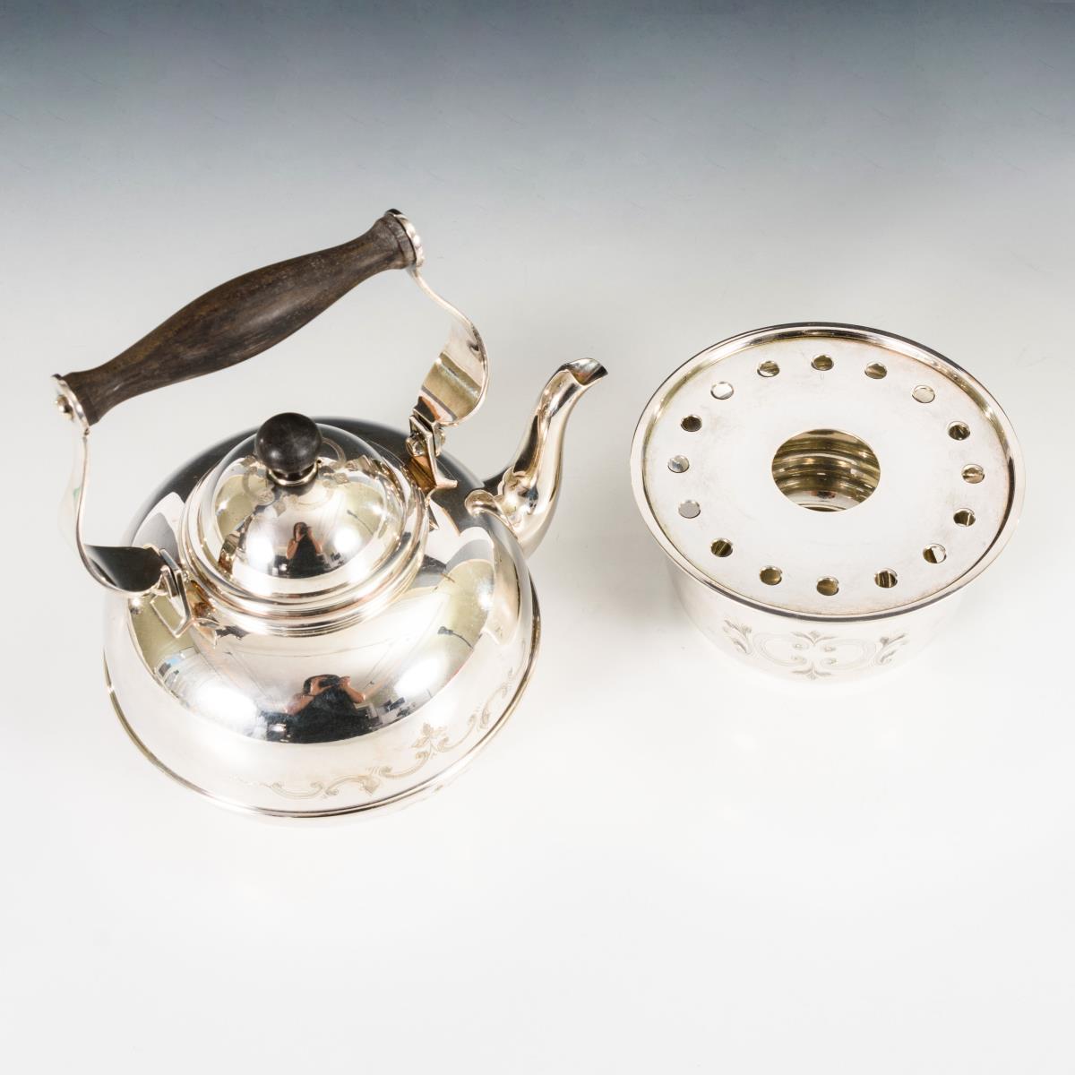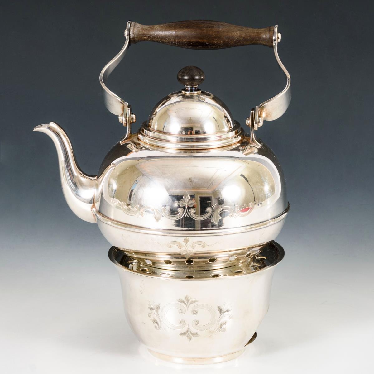 Bauchiges Kännchen mit Bügelhenkel und Holzgriff, dazu rundes Stövchen. Beide mit zarten Rankengravuren. Leichte Gebrauchsspuren.