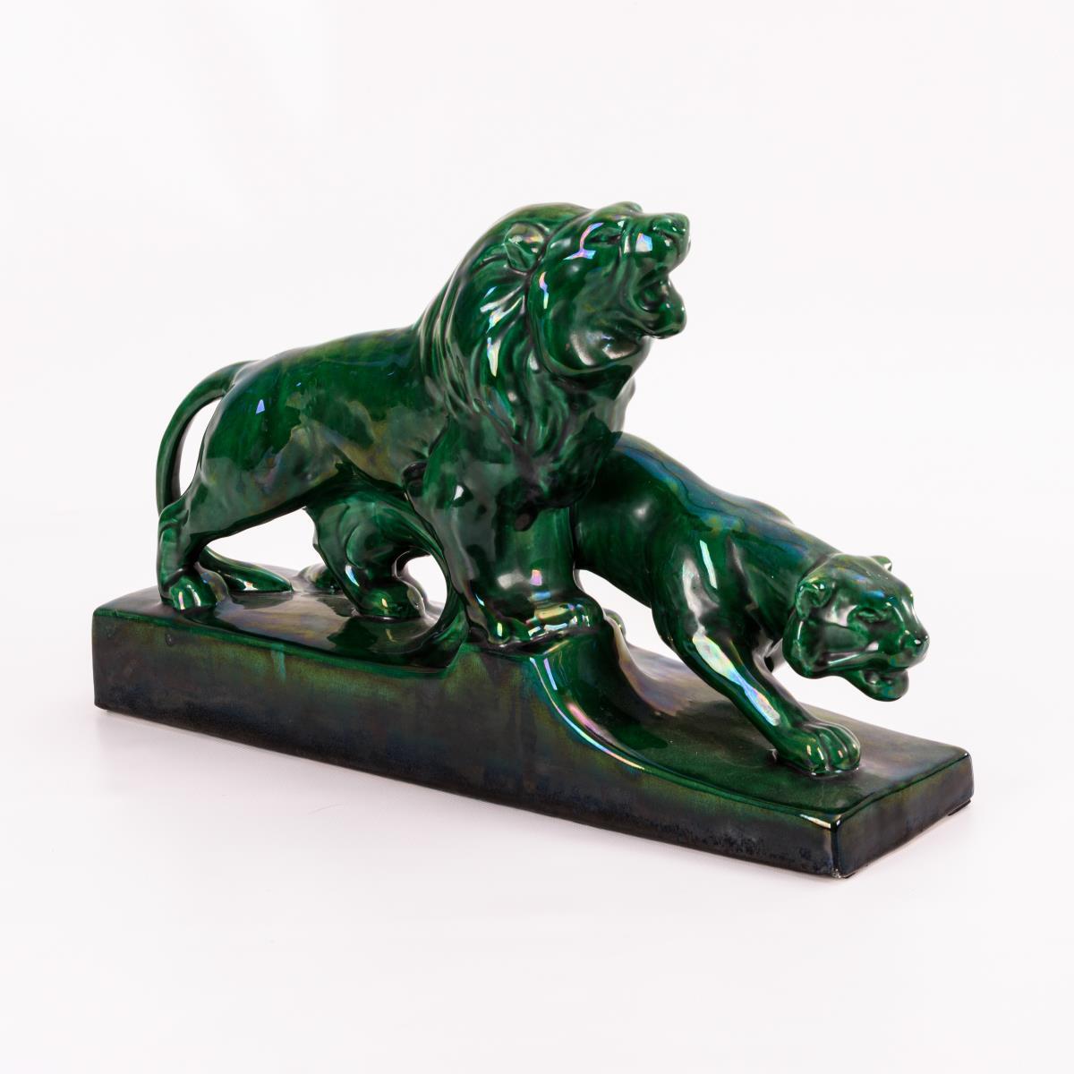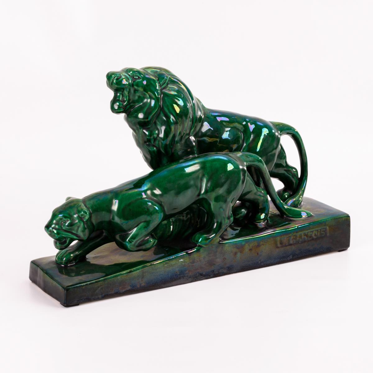 Große Art-déco-Löwengruppe. Francois Levallois, Faiencerie Sainte-Radegonde.