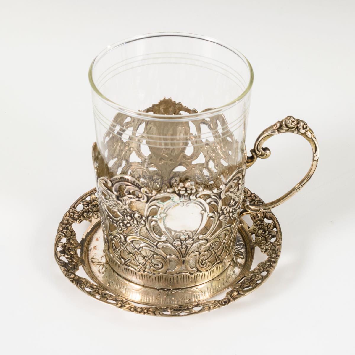 6 Teegläser mit Untersetzern. Adam Manns & Sohn.