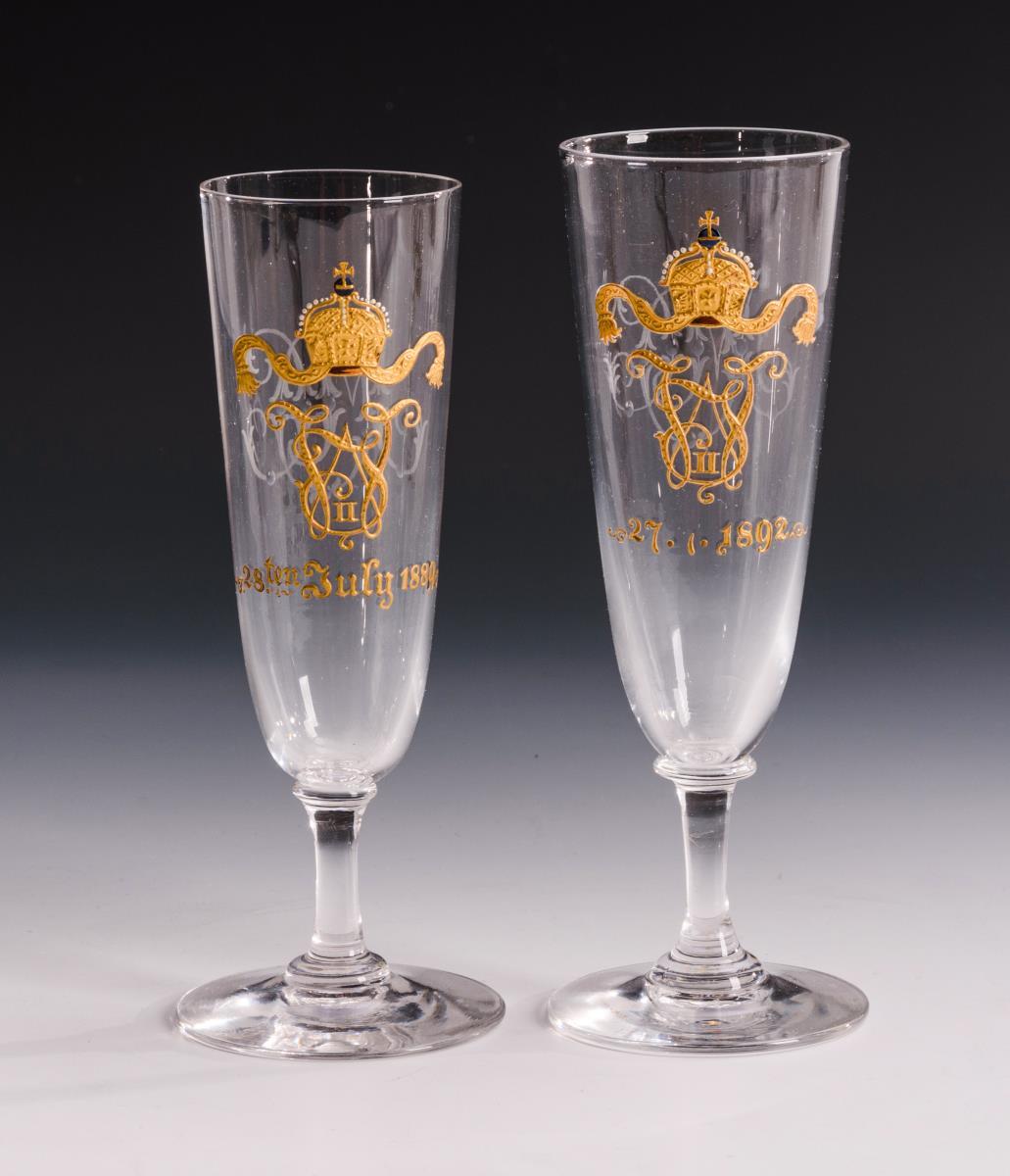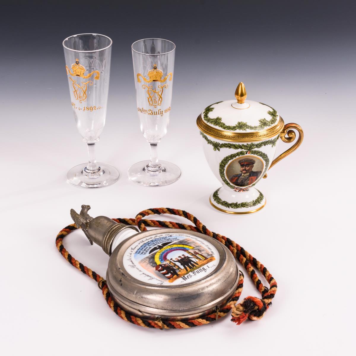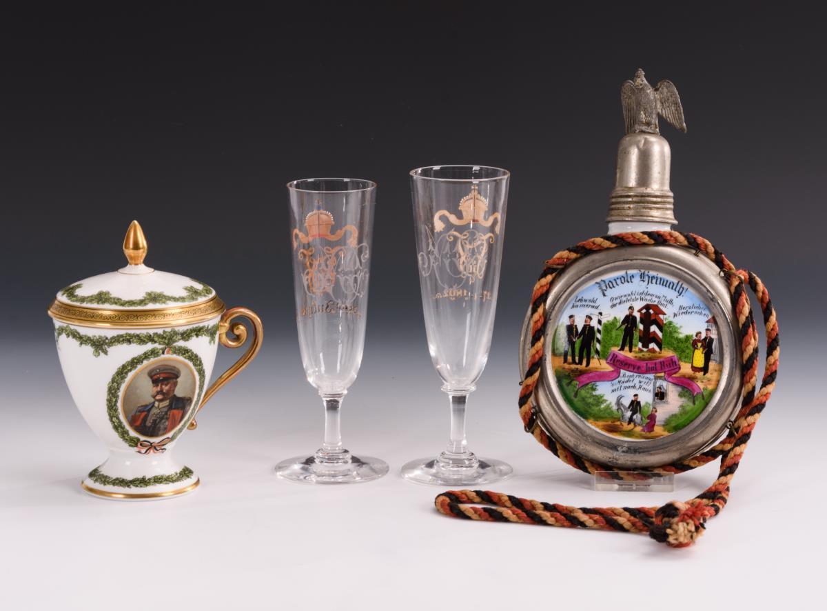 Tasse Hutschenreuther/Selb mit Datum 1915, mit dem Bildnis von Hindenburg in Uniform. / Gleich gestaltete Gläser mit Monogramm Kaiser Wilhelms II.(?) und Datum 1889 bzw. 1892, rückseitig je Monogramm "MOC". / Reservistenflasche "8. Comp. 4. Unterels. Inftr. Regt. Nr. 143 Straßburg 1901-1903". Reservistenflasche mit Alters-/Gebrauchsspuren.