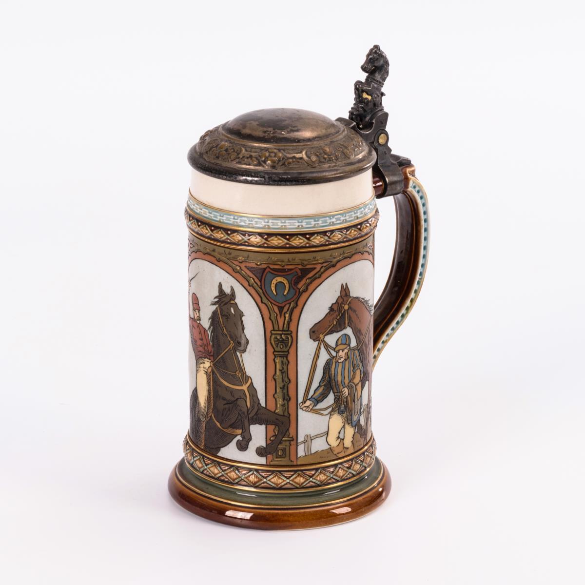 Historistischer Reliefkrug mit Ritzdekor und 3 Jockey-Motiven. Profilierter Metalldeckel mit Pferdedrücker. Metall mit Alters- und Gebrauchsspuren.