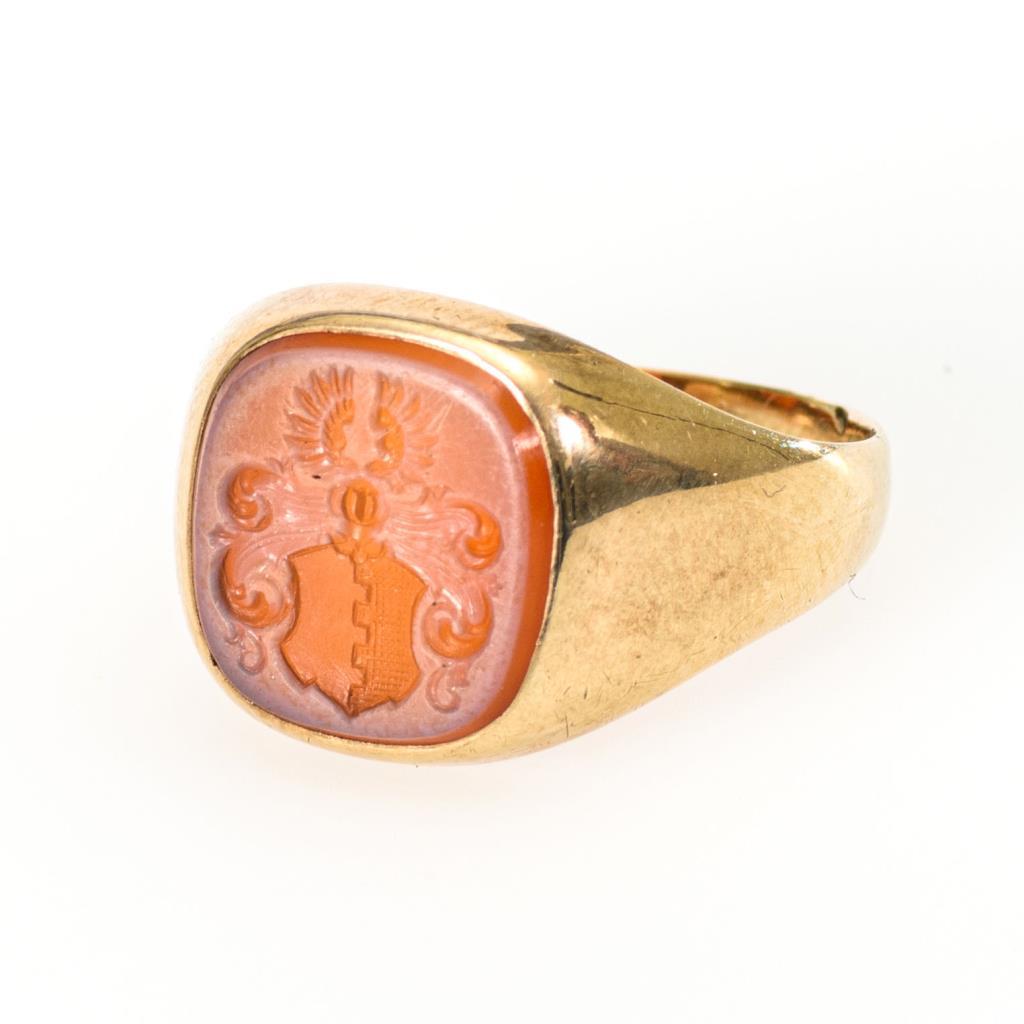 Hellbraune Achattafel mit geschnittenem Wappenmotiv, zwischen breiter Schiene.
