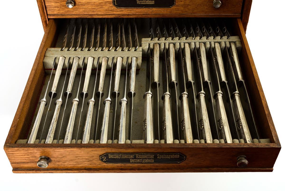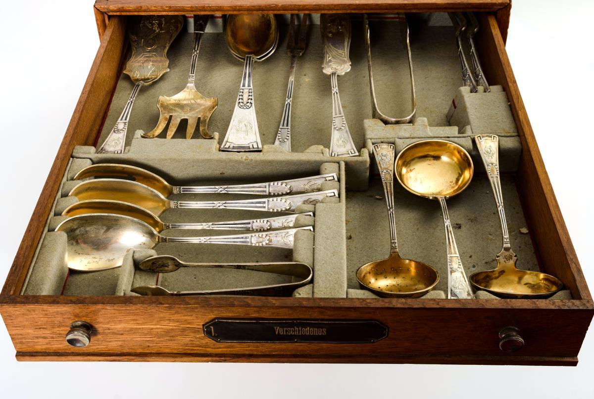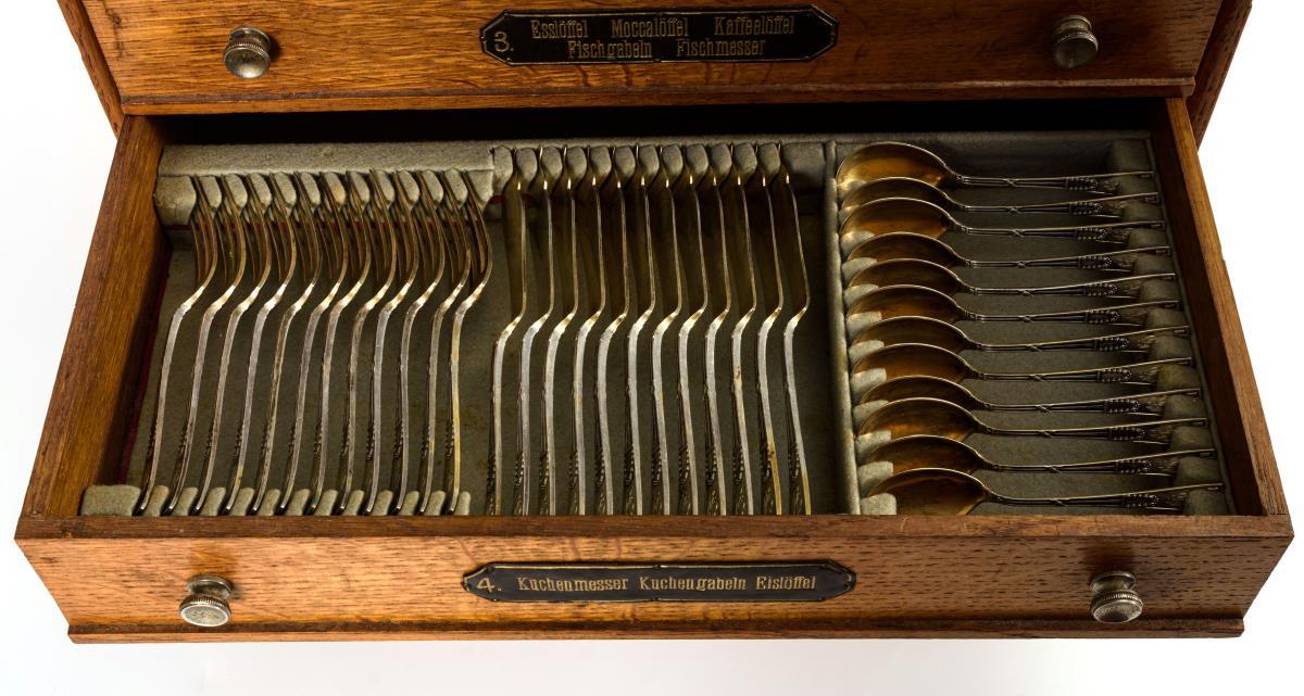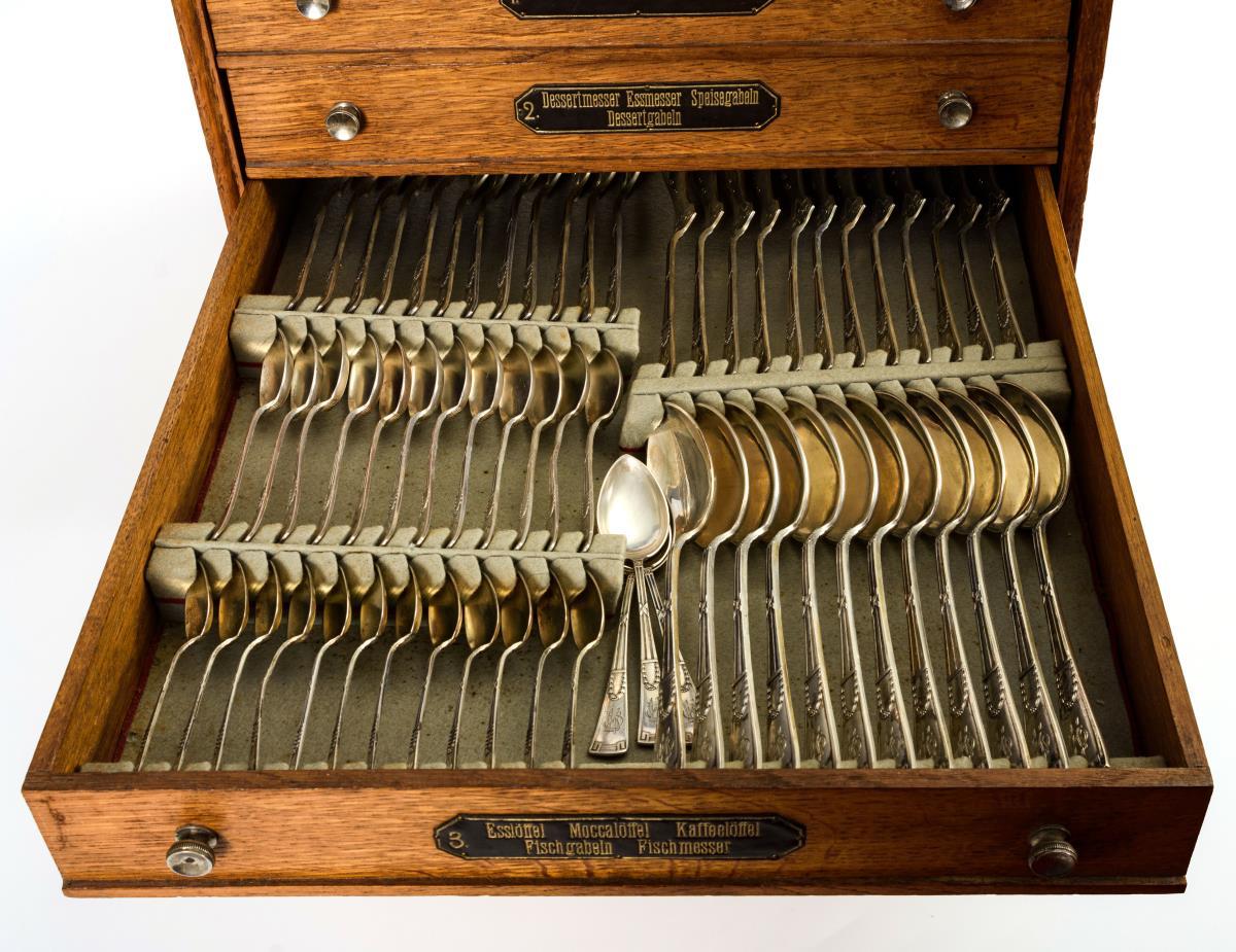 164 Teile mit reliefierten Griffen mit Kreuzband, Girlandenzier und Monogrammgravur "OKB". Darunter Speise-, Dessert-, und Fischbesteck, verschiedene Löffel und Vorlegeteile. In originalem Besteckschrank mit 5 beschrifteten Schüben.