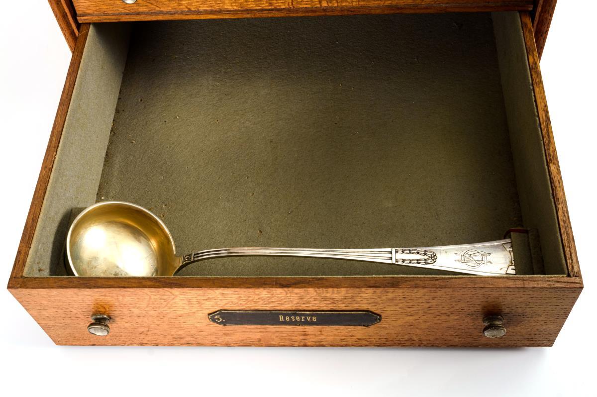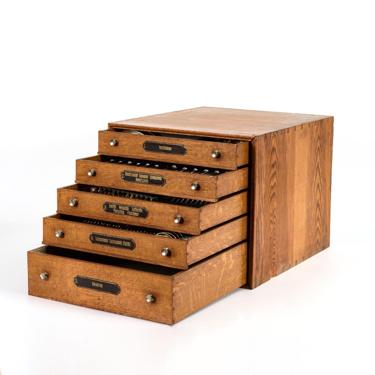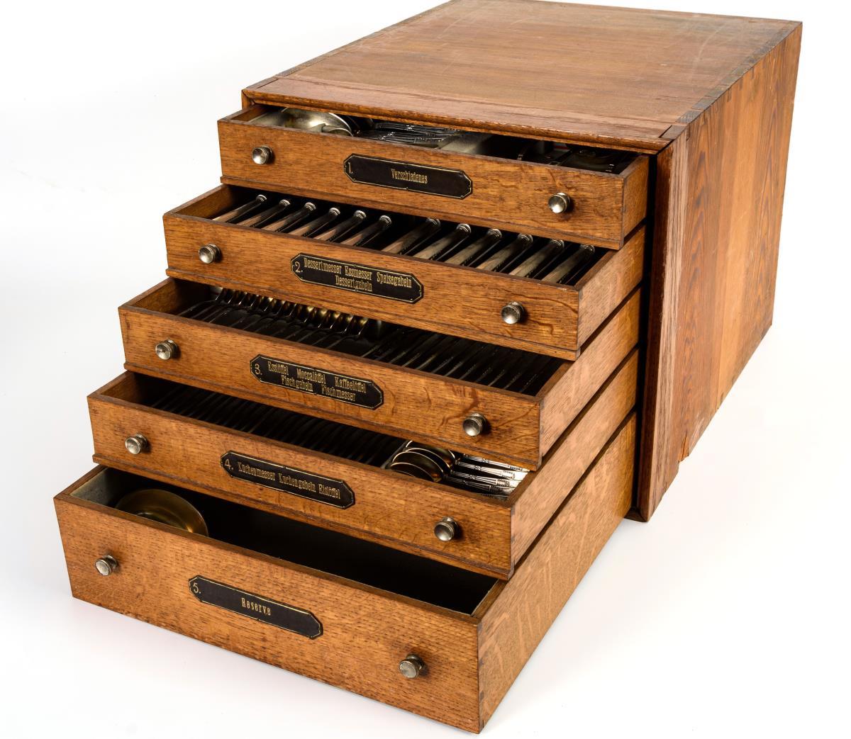 164 Teile mit reliefierten Griffen mit Kreuzband, Girlandenzier und Monogrammgravur "OKB". Darunter Speise-, Dessert-, und Fischbesteck, verschiedene Löffel und Vorlegeteile. In originalem Besteckschrank mit 5 beschrifteten Schüben.