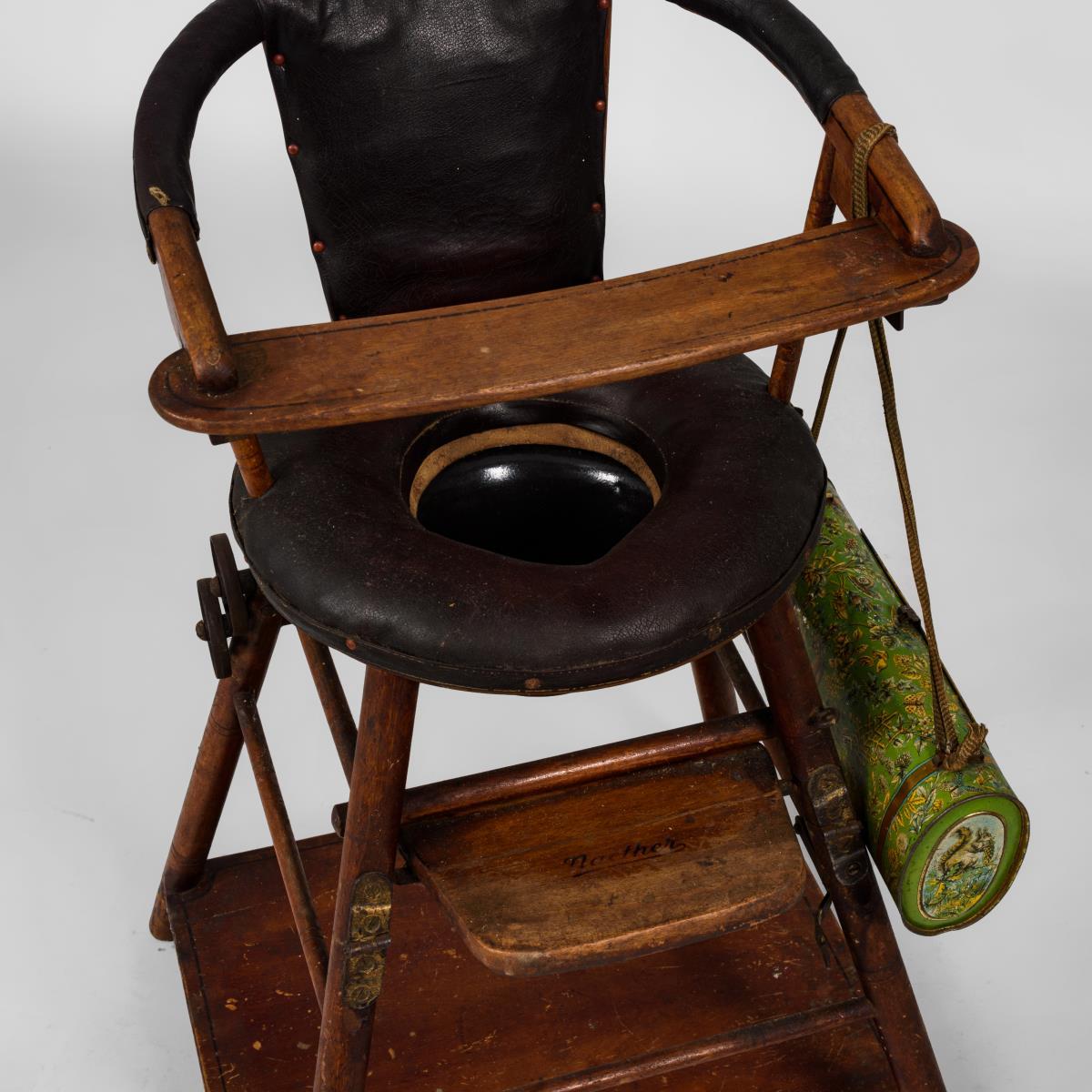 Multifunktioneller Hochstuhl mit integriertem, herausnehmbarem Töpfchen, einklappbarer Fußstütze und beweglichem Sicherheitsbügel, Fußteil mit Ablage. Durch Klappfunktion als rollbarer Spieltisch verwendbar: Tischplatte mit Beweglichkeitsspiel und Abziehbild mit Automobil und Kühen. Sitzfläche und Lehne mit schwarzem Lederbezug. Als Beigabe eine Botanisiertrommel aus Blech. Stärkere Alters-/Gebrauchsspuren, Mechanik funktioniert, Leder etwas rissig.