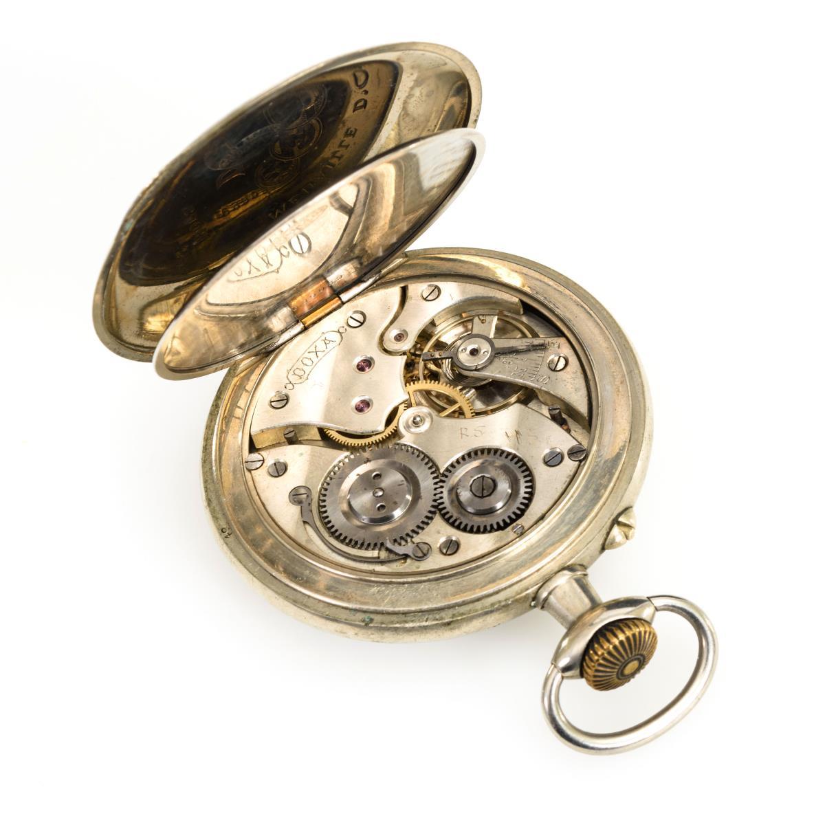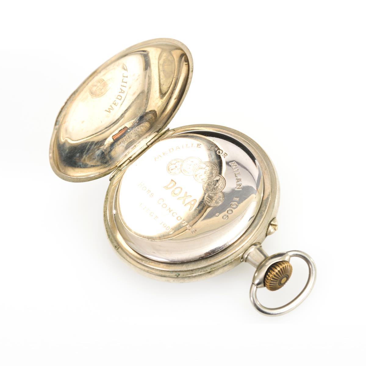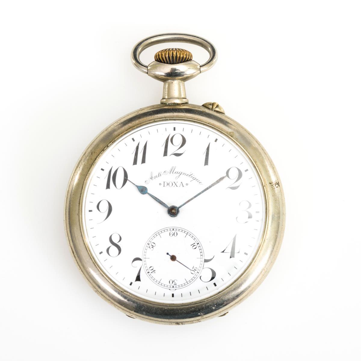 Gemarktes Stahlwerk mit Ankerhemmung, Schraubenunruh und Kronenaufzug. Weißes Emailzifferblatt mit arabischen Zahlen, Minutenkranz, kleiner Sekunde und Spade-Zeigern. Herstellerprägung Anzeige: Anti-Magnétique Doxa.