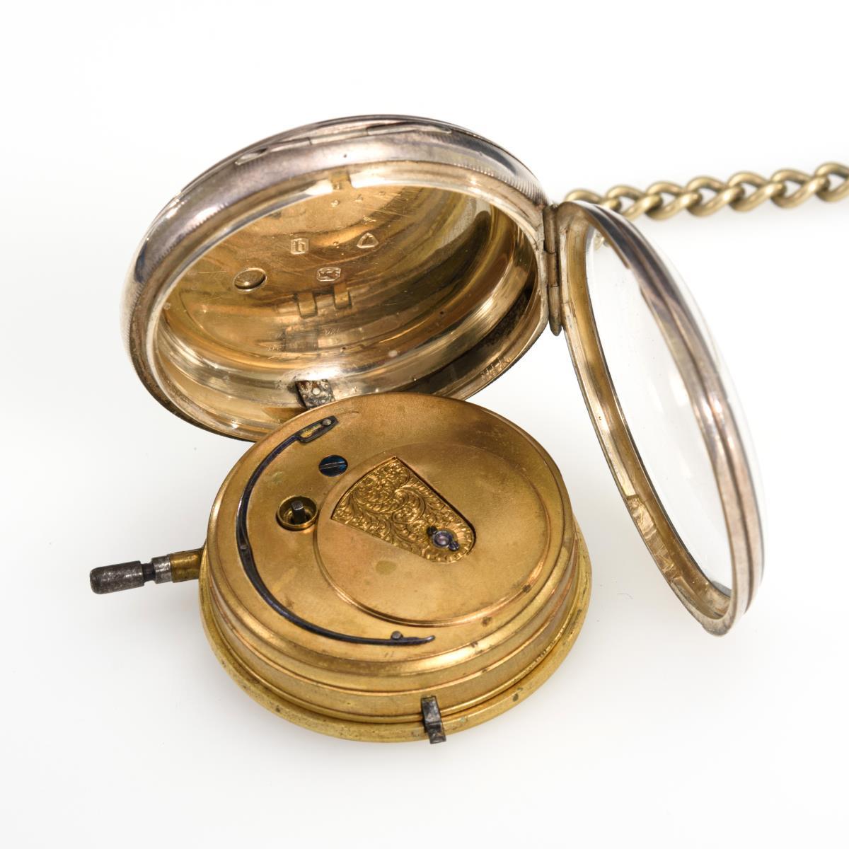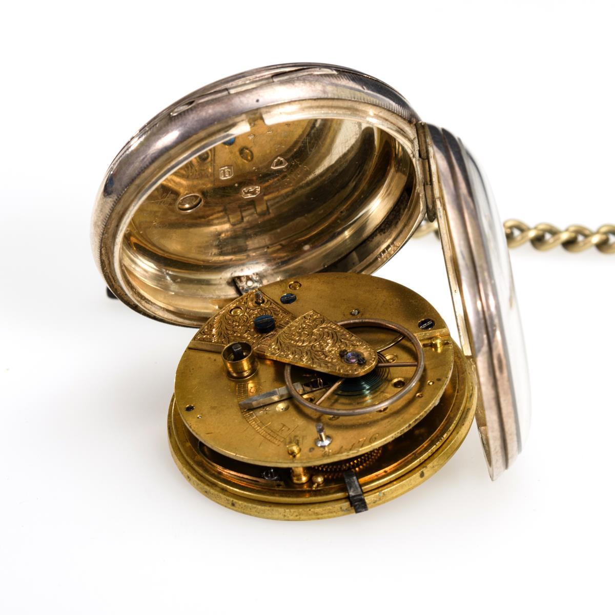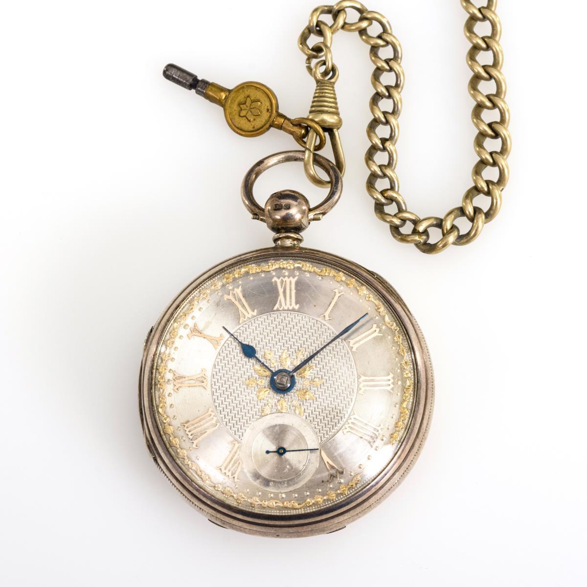 Silberne englische Taschenuhr mit Uhrenkette.