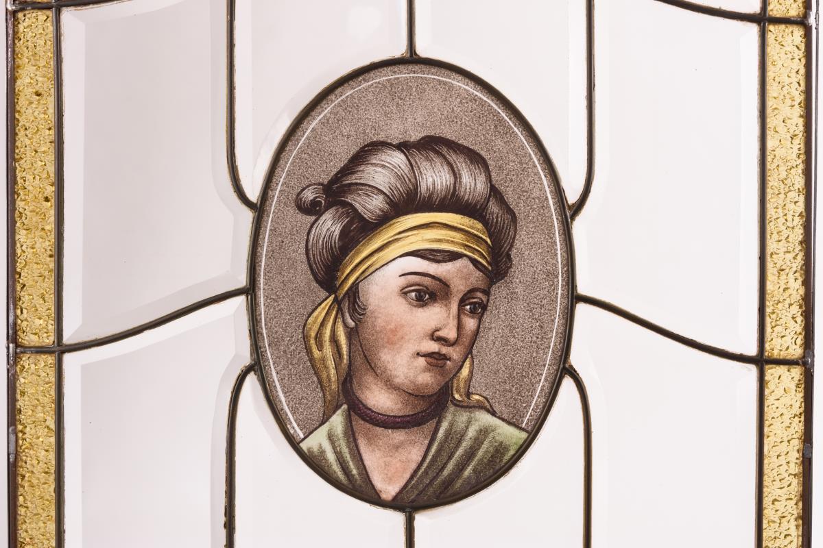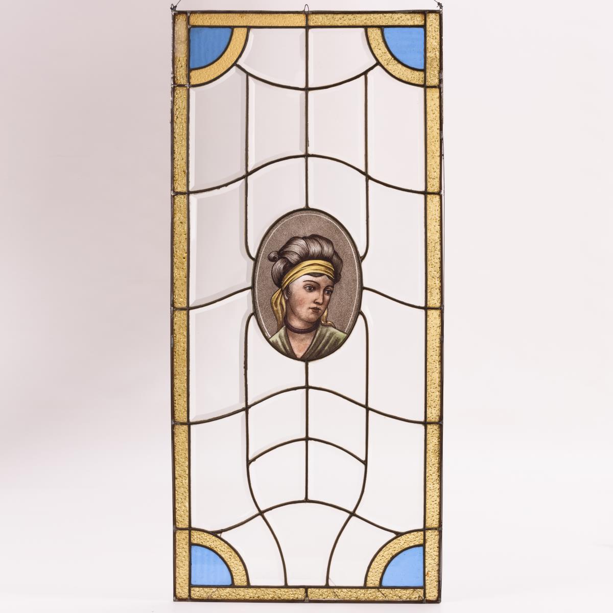 Farbige Gläser als Rahmung, Linien-Ornament durch die Ruten sowie zentrales Bildnis einer jungen Frau mit Haarbinde. Einige Gläser im Randbereich gesprungen, Rahmen leicht verzogen.