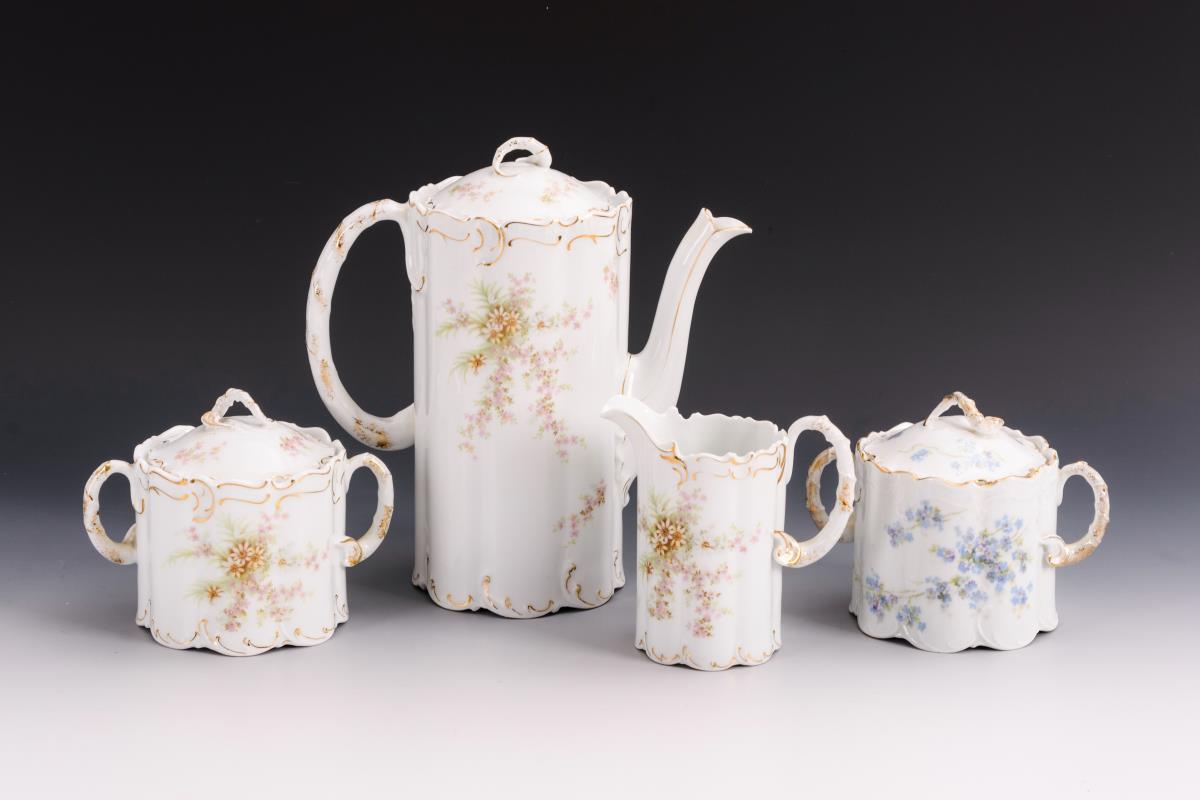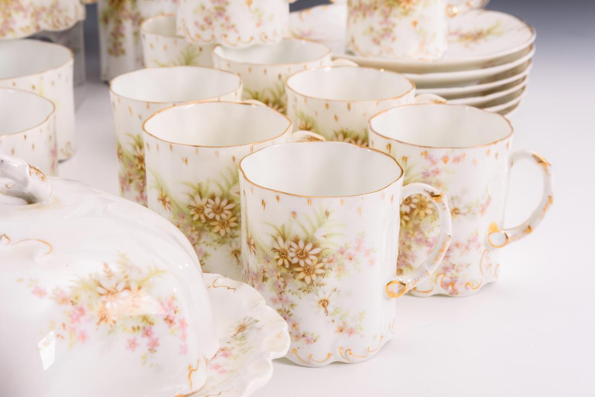 39 + 1 Teile. Kaffeekanne (H 23,5 cm), Milchkännchen, Zuckerdose, Butterdose, 7 Milchkaffeetassen + 8 Untertassen und 10 Kaffeetassen + 10 Untertassen. Als Zugabe 1 Zuckerdose mit Vergißmeinnichtdekor. Haarriss im Milchkännchen und 1 Milchkaffeetasse, partiell minimaler Goldabrieb.