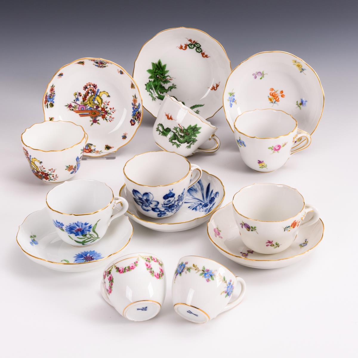 Form "Neuer Ausschnitt". Verschiedene Dekore (Blaue Blume, Streublümchen, Gelber Löwe, Grüner Hofdrache). 6 Mokkatassen (H 5 cm) und 6 Untertassen (Ø 10,5 cm). Als Zugabe 2 Mokkatassen mit Schwanenhenkel.