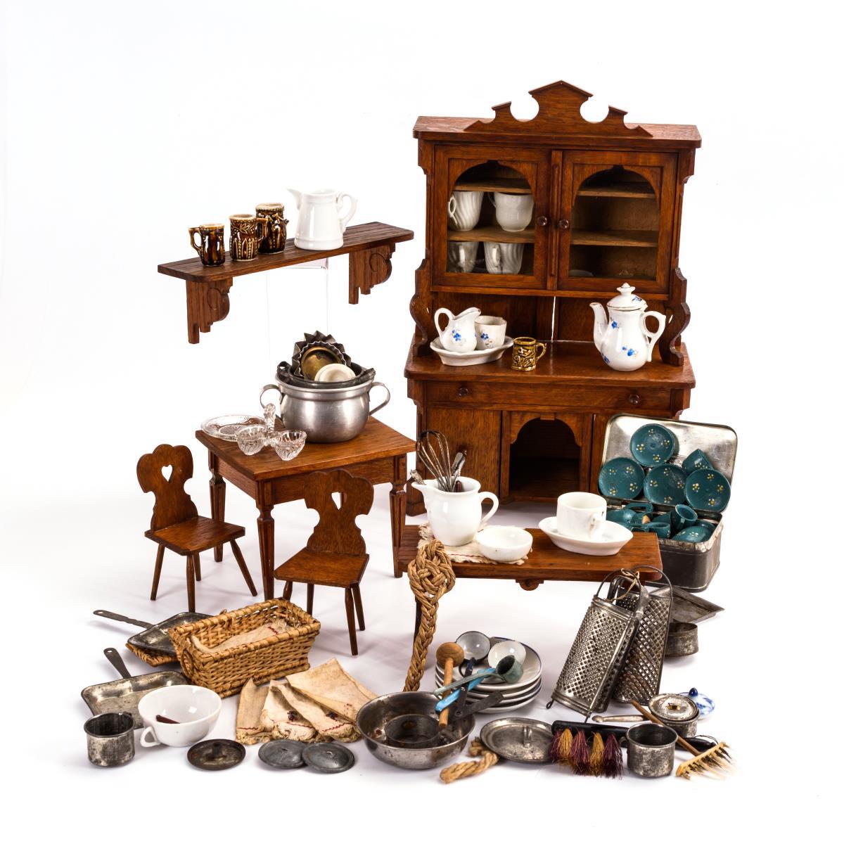 Eichenmöbel (Aufsatzbüffet, Tisch, Bank, 2 Stühle und Wandbord), dazu verschiedenes Geschirr und Zubehör aus Holz, Blech, Porzellan etc. Bespielt, Altersspuren, 1 Glasscheibe provisorisch befestigt.