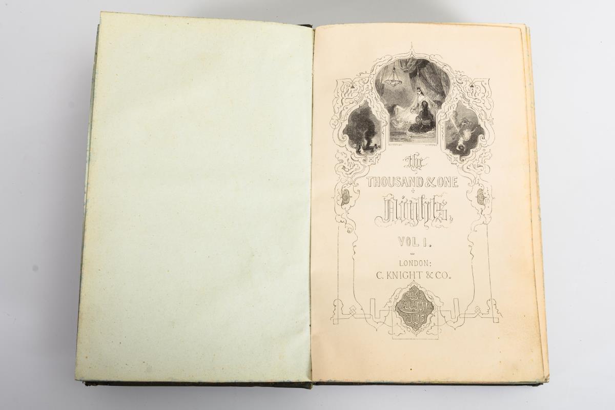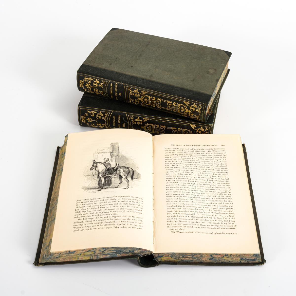 Übersetzt von William Lane, vollständige Ausgabe mit sehr vielen Illustrationen. Goldgeprägter Halbledereinband mit Altersspuren.