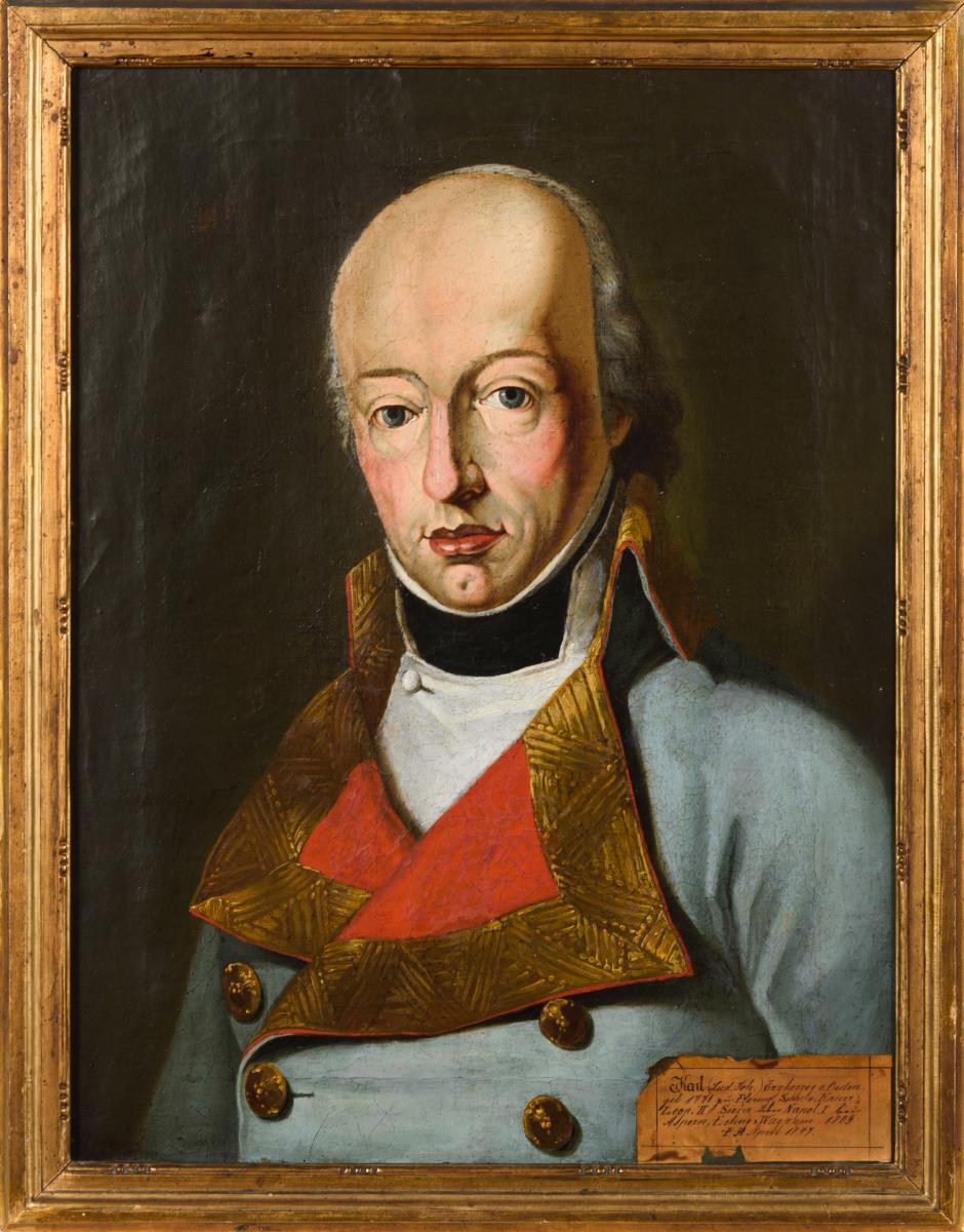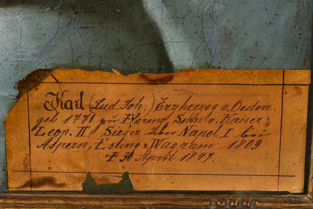Der Erzherzog im hellblauen Rock vor neutralem Hintergrund. Leichte Altersspuren.