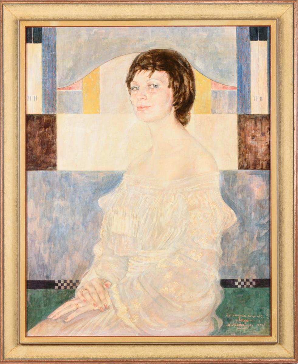 Bildnis einer jungen Frau mit modischem Kurzhaarschnitt und im weißen Kleid.