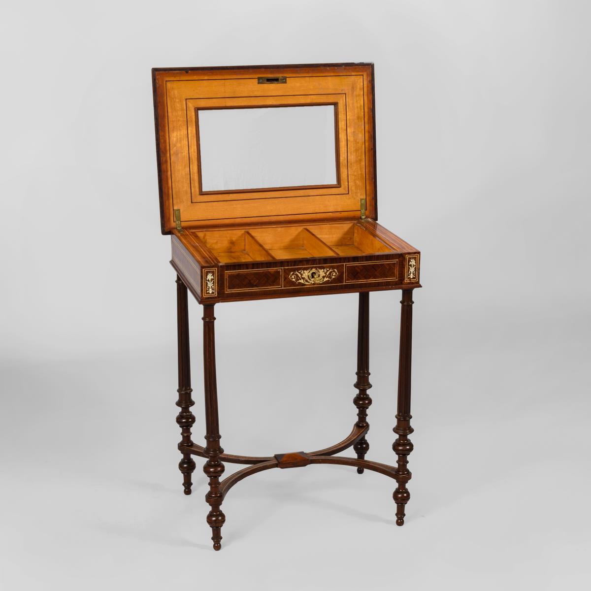 Näh- und Schminktisch im Louis XVI./Napoleon III.-Stil, dekoriert mit feinen Band- und floralen Elfenbeinmarketerien, auf 4 fußverstrebten Drechselbeinen. Klappbare Tischplatte mit Innenspiegel und herausziehbarem Schub mit Innenfächern. Alters-/Gebrauchsspuren.