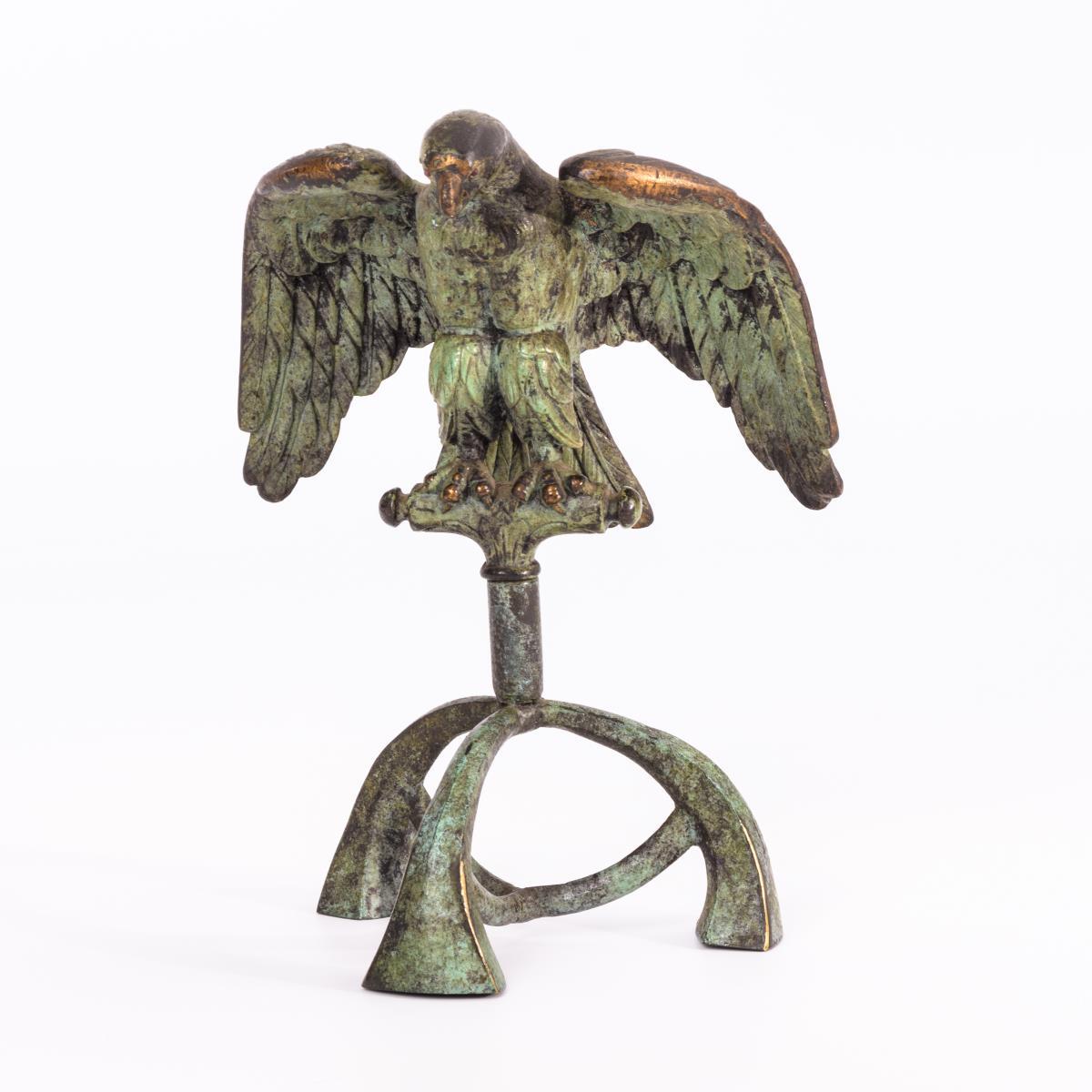 Mit ausgebreiteten Flügeln stehender Adler. Schnabel aufgesägt und beschliffen, wohl entferntes Attribut, Patina berieben.