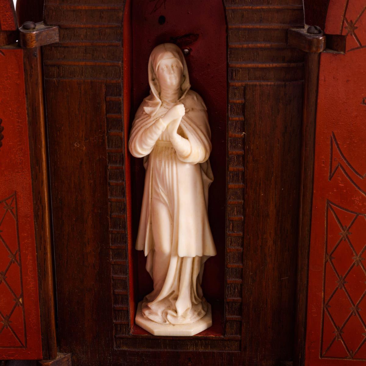 Elfenbein, Mahagoni massiv und furniert, teils rot gefasst. H Madonna 12,5 cm, gesamt 46 x 18 x 8 cm.