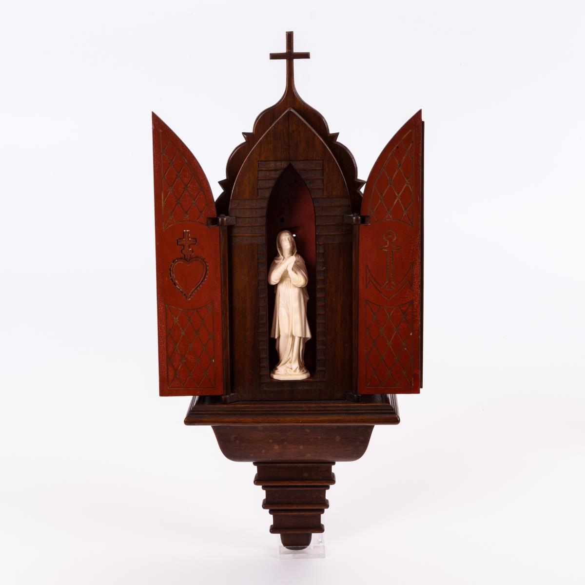 Die vollplastische Standfigur der berühmten Madonna nachträglich im gotisierenden Hausaltar mit Flügeltüren eingestellt. Kleiner Haarriss am Kopf, Altar minimale Alters-/Gebrauchsspuren.