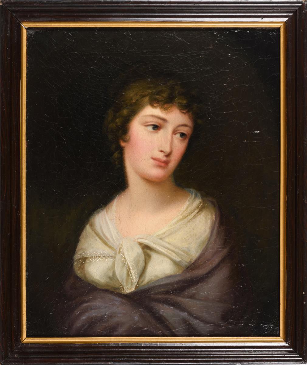 Bildnis einer jungen Frau mit gelocktem Haar und in weiß-violettem Gewand. Altersspuren.