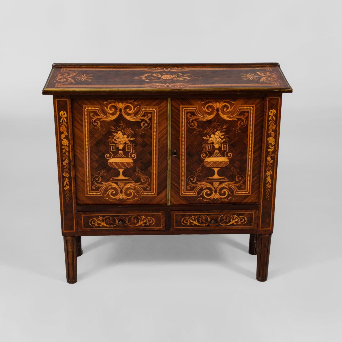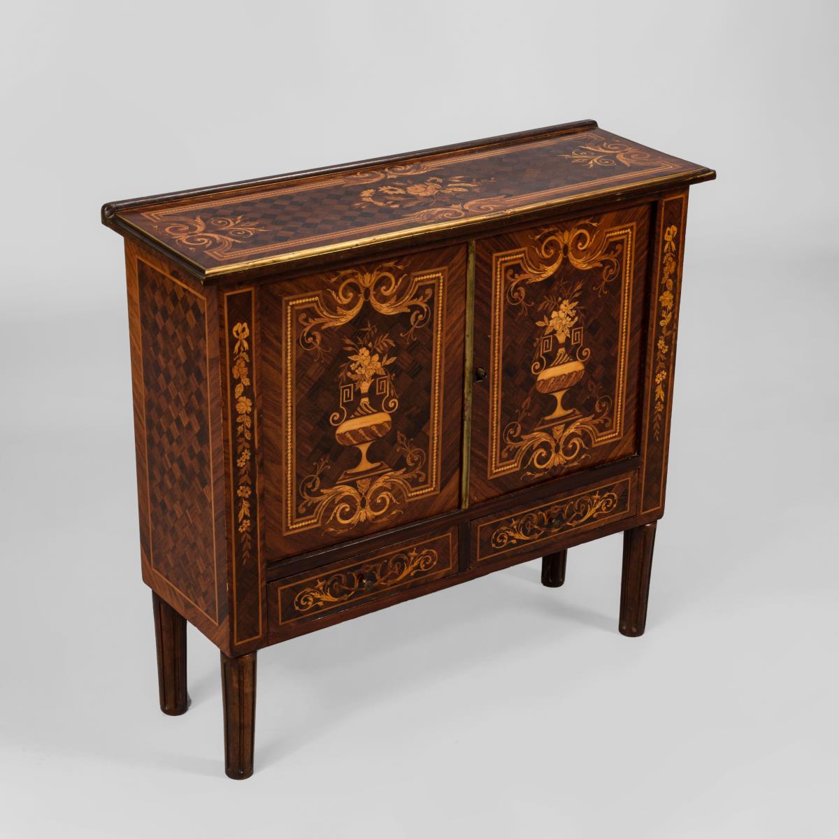 2-türiges Beistellschränkchen mit 2 kleinen Sockelschüben, auf 4 kannelierten Säulenbeinen. Üppig dekoriert mit Vasen- und Rankenmarketerie im Stil der beliebten holländischen Blumendekore sowie Messingbänder an Deckplatte und Tür. Alters-/Gebrauchsspuren.