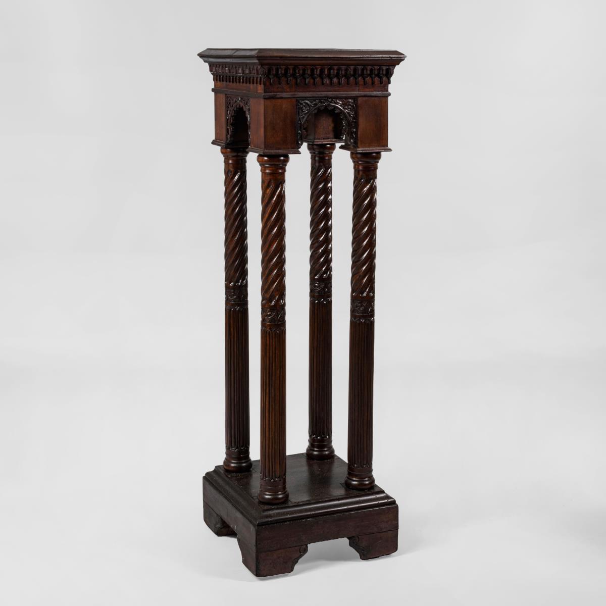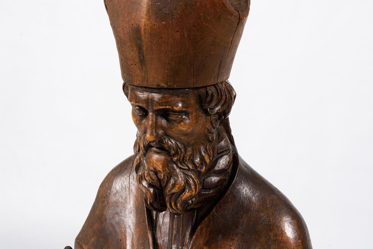 Standfigur eines Bischofs im Redegestus. Allansichtiges Postament mit 4 verzierten Vollsäulen und ornamental beschnitzten Schweifbrettern sowie Zierfries. Einige Anobienspuren und Trockenrisse, 5 Finger geklebt, davon 1 ergänzt, Stab wohl ergänzt.