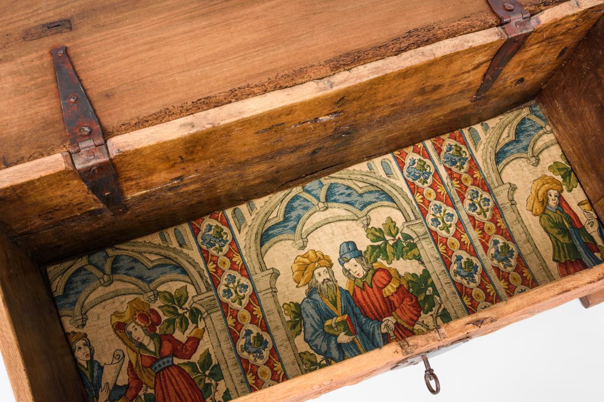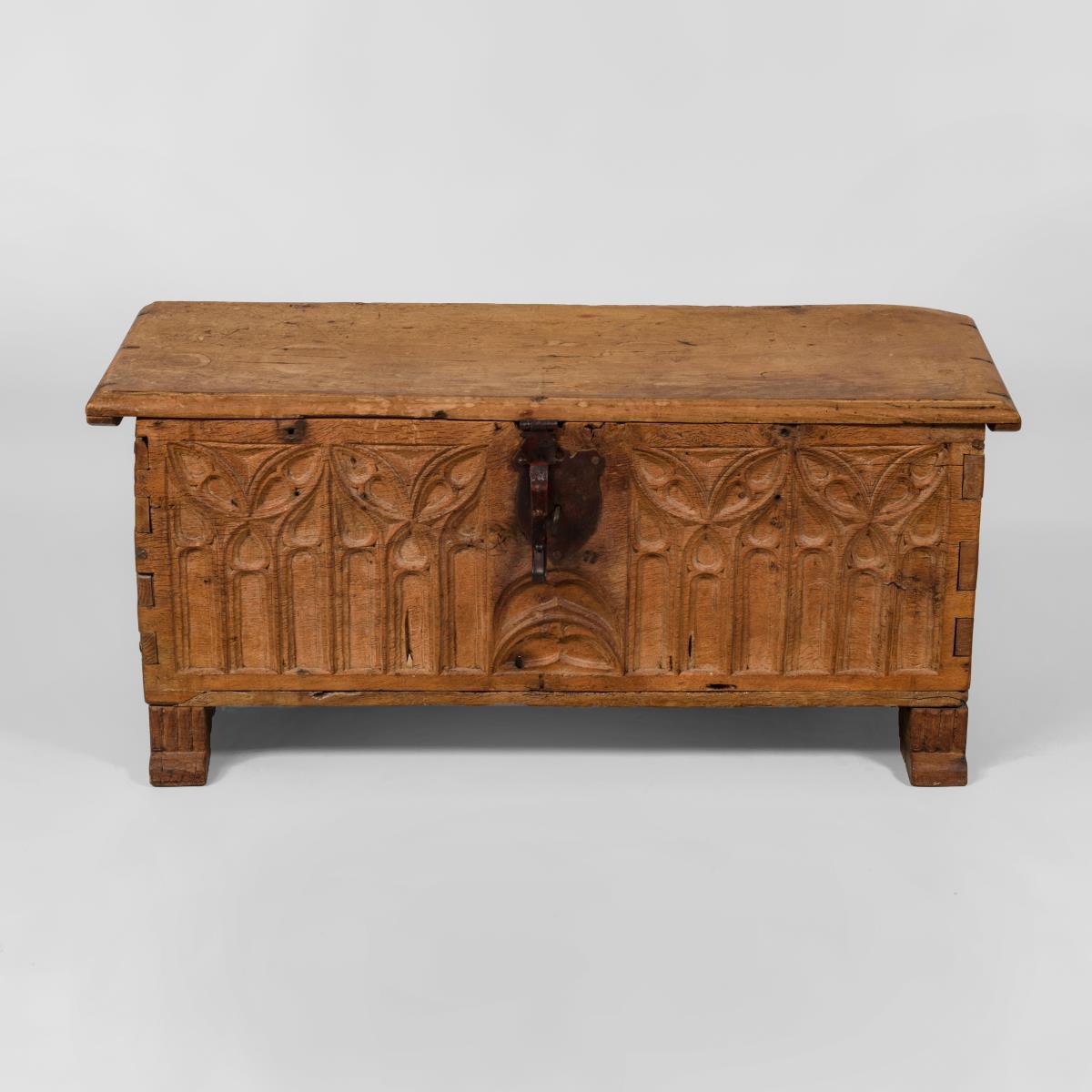 Gotische Maßwerk-Schnitzerei, Eisenbänder und schildförmiger Schlüsselbeschlag. Boden innen mit figürlich-gotisierendem Stoffbezug. Unter Verwendung alter Teile, Alters-/Gebrauchsspuren, Schloss fehlt, Füße ergänzt.