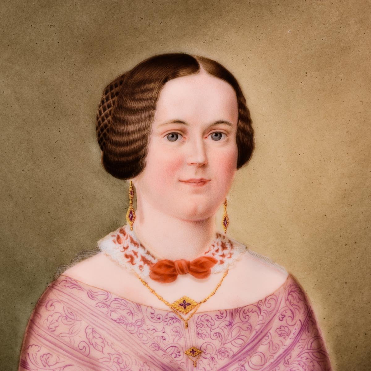 Rechteckige Platte mit dem Bildnis einer jungen Biedermeier-Dame.