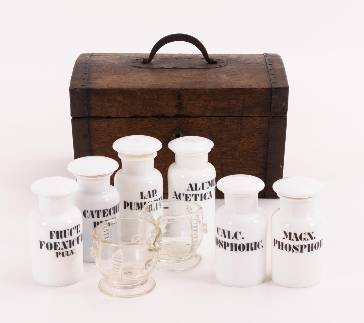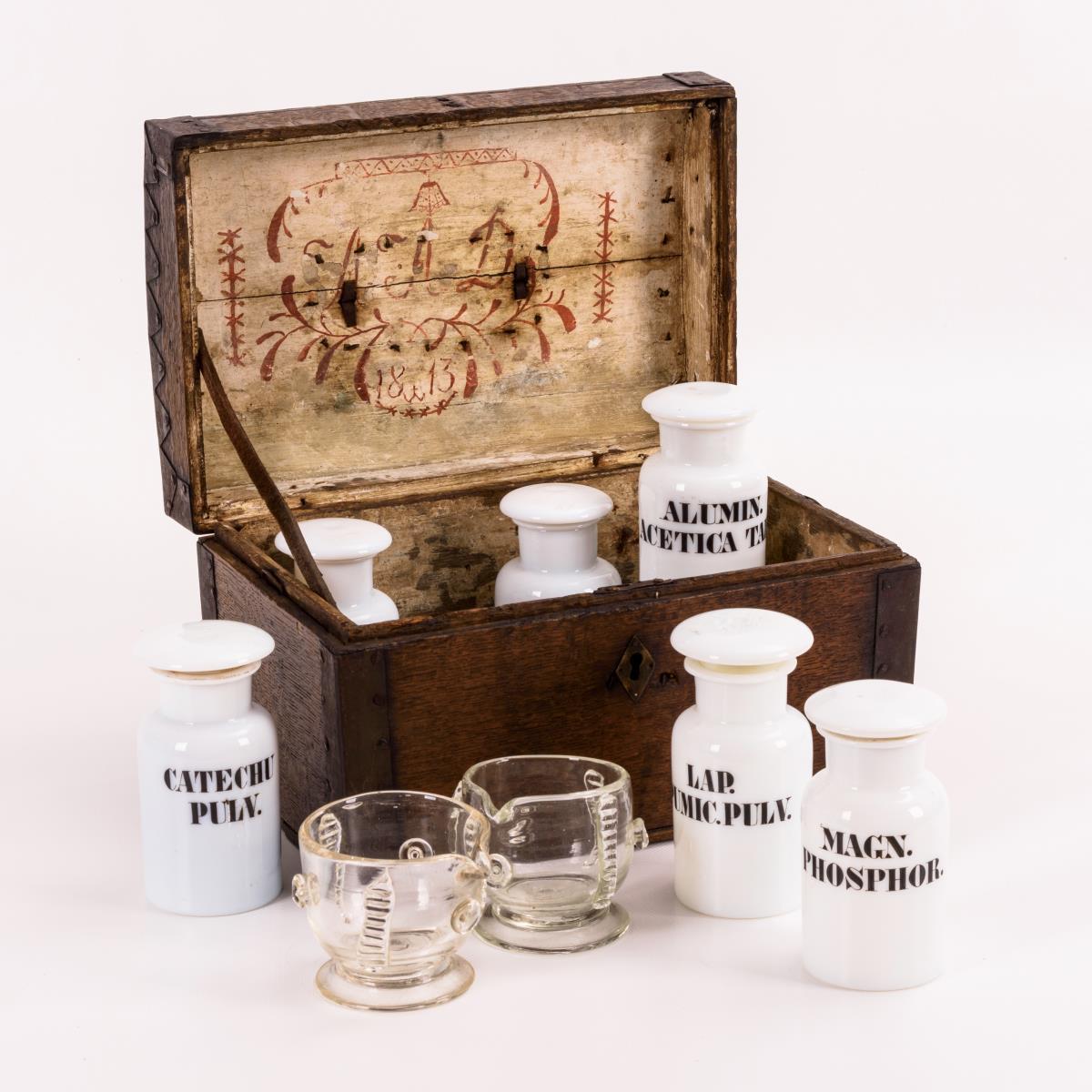 Leicht gerundeter Scharnierdeckel, im Deckel Ornamentkartusche mit Monogramm "AAD" und Datum. Dazu 6 opalinweiße, beschriftete Apothekenflaschen sowie 2 Glasmörser ohne Pistill. Geheimfächer entfernt, Eisenbeschläge nachträglich, einige Alters-/Gebrauchsspuren.