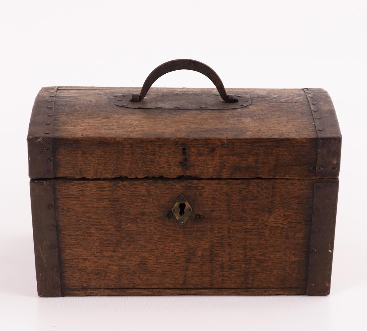 Eiche massiv, Eisenbeschläge, Messing-Scharniere und -Schlüssellochbeschlag, innen weiß gefasst mit roter Bemalung. 18 x 30 x 20 cm.