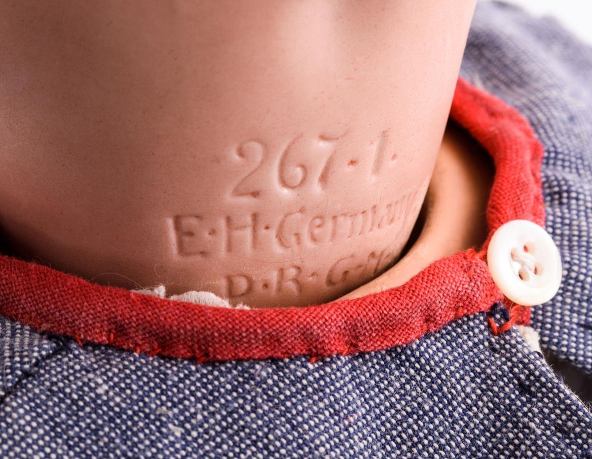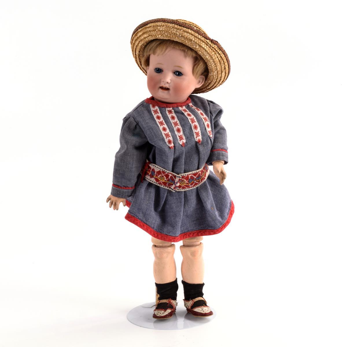 Kurbelkopf, blaue Schlafaugen, Wimpern, offener Mund, Zunge, blonde Mohairperücke. 15-teiliger Toddlerkörper. Nachgenähtes Kosakenhemd, rot-weiße Schuhe, Strohhut. Kopf durchleuchtet: ohne Defekte. Am Körper einige lose Farbschollen fixiert.