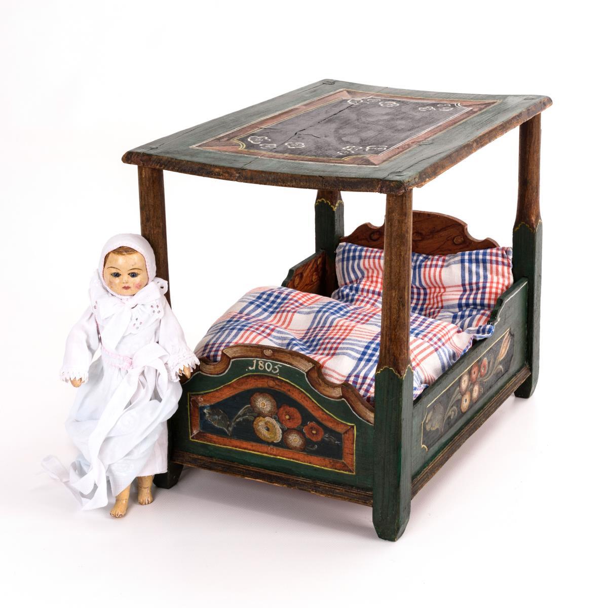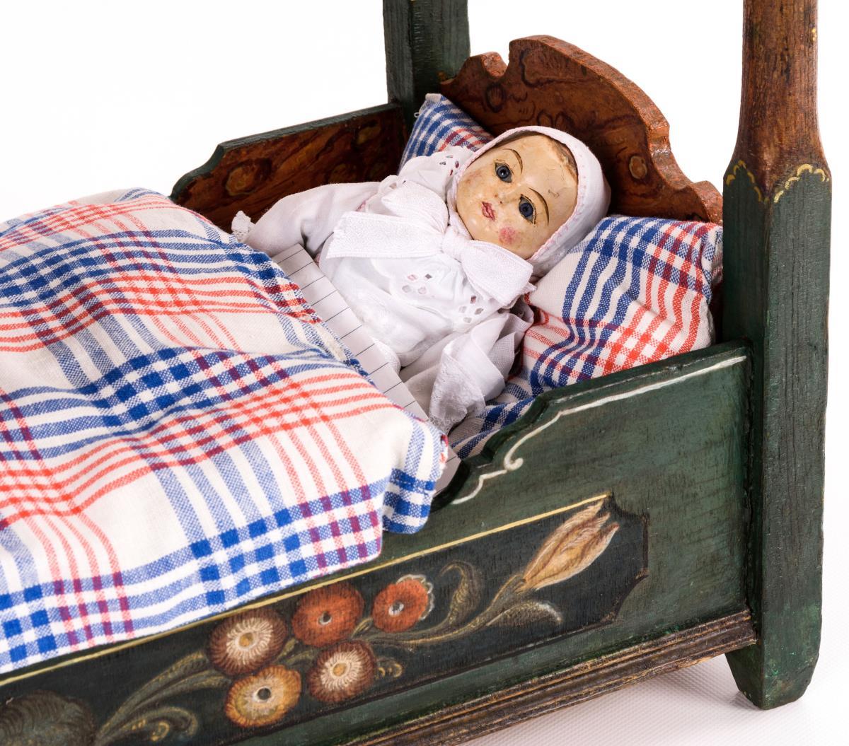 Bemaltes Puppenbett mit Baldachin. Dazu Sonneberger Holzdocke als Täufling mit beweglichen Gliedern und eingesetzten blauen Glasaugen (L 27 cm). Bett: Trockenrisse, inaktiver Anobienbefall. Puppe: Kopf restauriert (lose Farbschollen im Gesicht der Puppe fixiert).