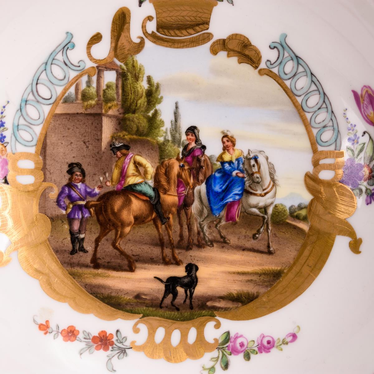 Hausmalerei. Auf Tasse und Untertasse eine Kartusche mit kleinen Blumenbuketts an einem goldradierten Rahmen, darin Reiterszenen. Haarrissspinne in der Untertasse, minimaler Goldabrieb.