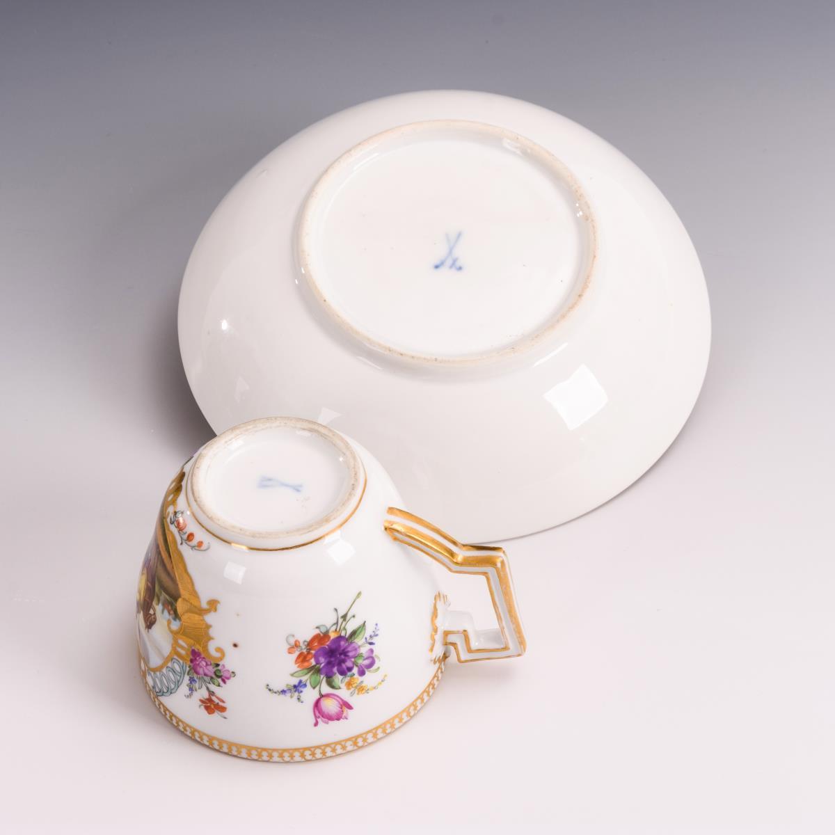 Polychrom bemalt, goldstaffiert. H Tasse 6 cm, Ø Untertasse 14 cm.